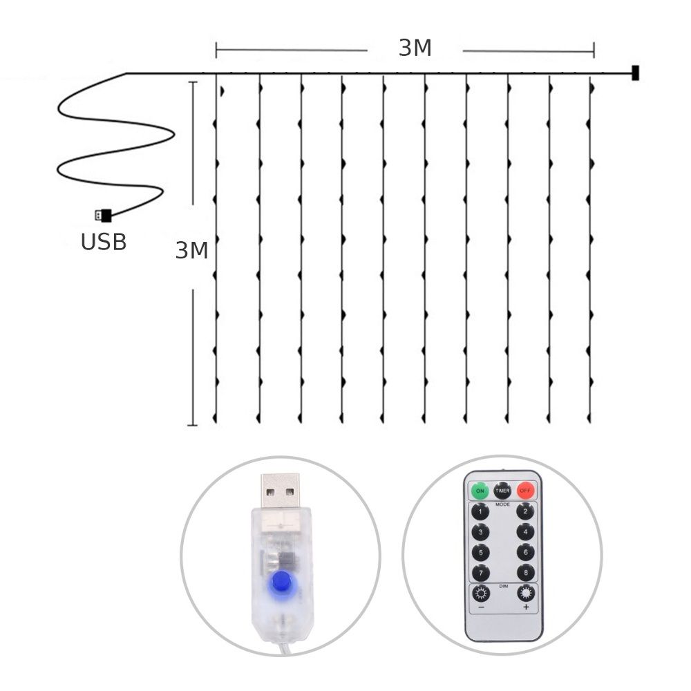 Светодиодная USB гирлянда штора 3x3 м, медная нить, теплый белый, без крючков, 8 режимов, с пультом