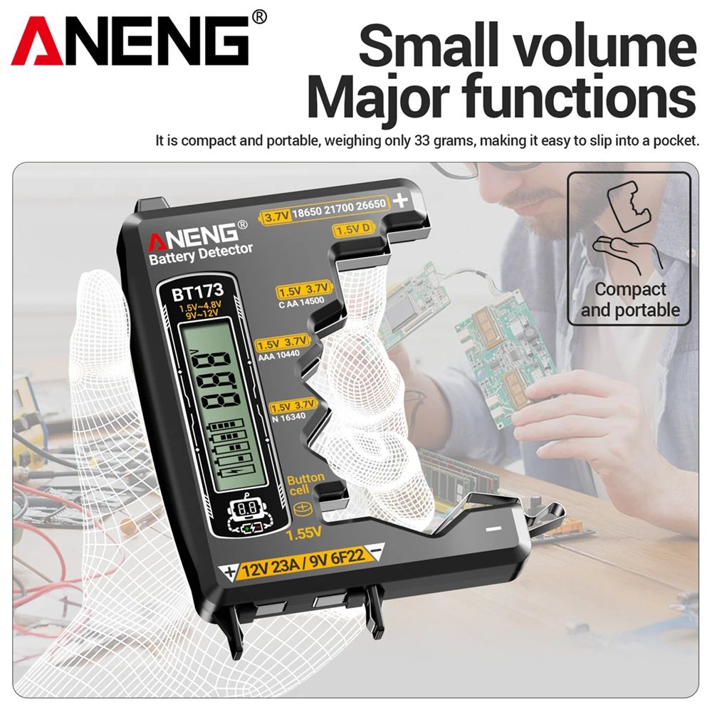 ANENG BT173 — это универсальный электронный тестер батареек или аккумуляторов с двойным цифровым дисплеем, предназначенный для быстрой и точной проверки уровня заряда элементов питания различного типа.