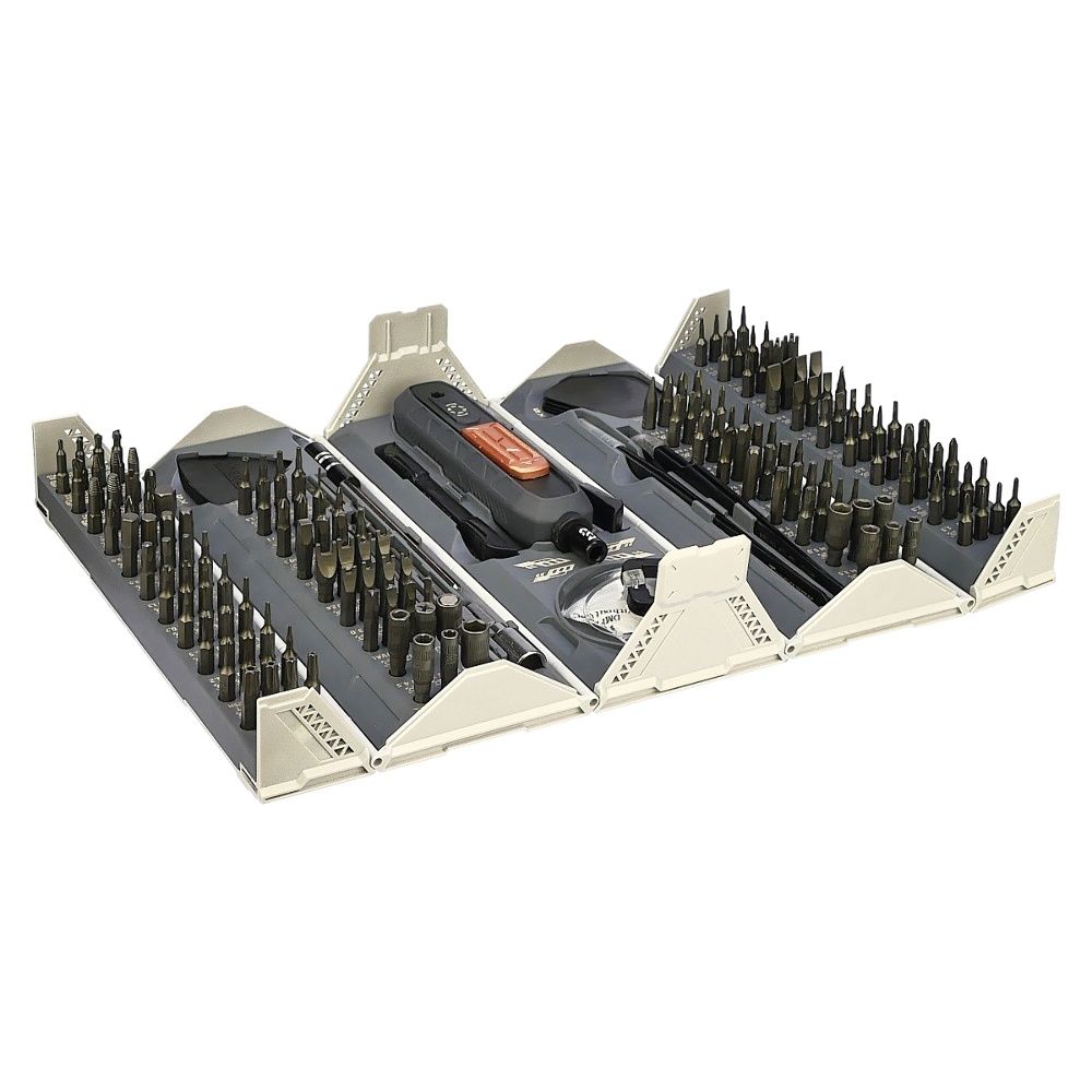 Это большой прецизионный набор для ремонта электроники и бытовой техники. В одном компактном «контейнере» вы получаете удобную ручку-держатель, 160 магнитных бит практически всех популярных профилей, удлинитель, пинцеты и аксессуары для аккуратного разбора смартфонов, планшетов, ноутбуков и другой техники.