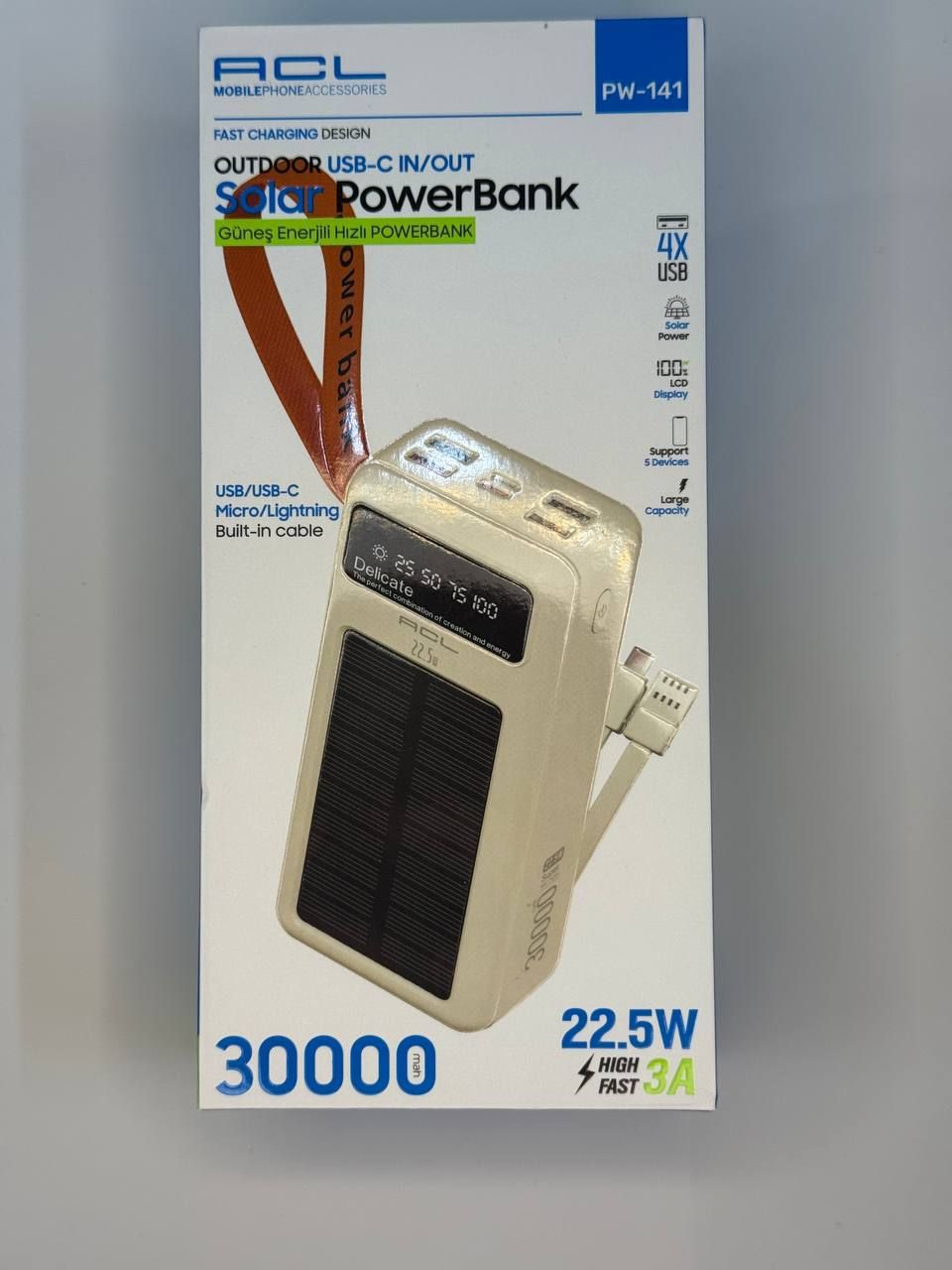 Это универсальный повербанк с солнечной панелью и встроенными кабелями, рассчитанный на ежедневное использование в городе и на выездах. Подходит для зарядки смартфонов, планшетов, наушников, колонок, экшн-камер, смарт-часов и другой портативной электроники.