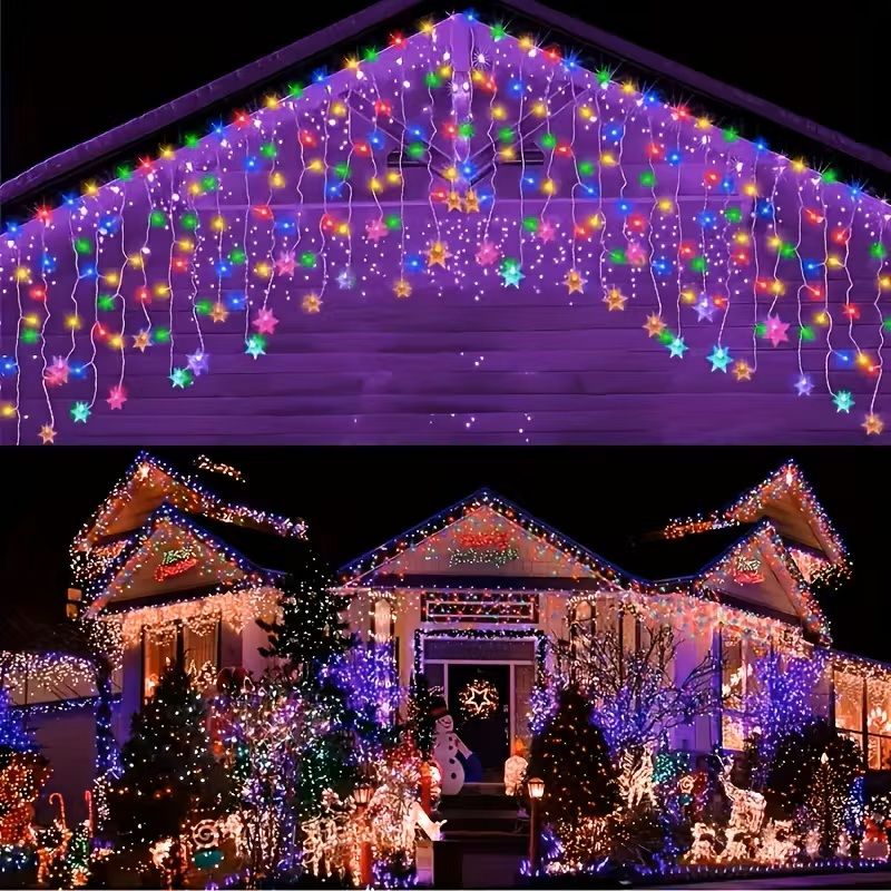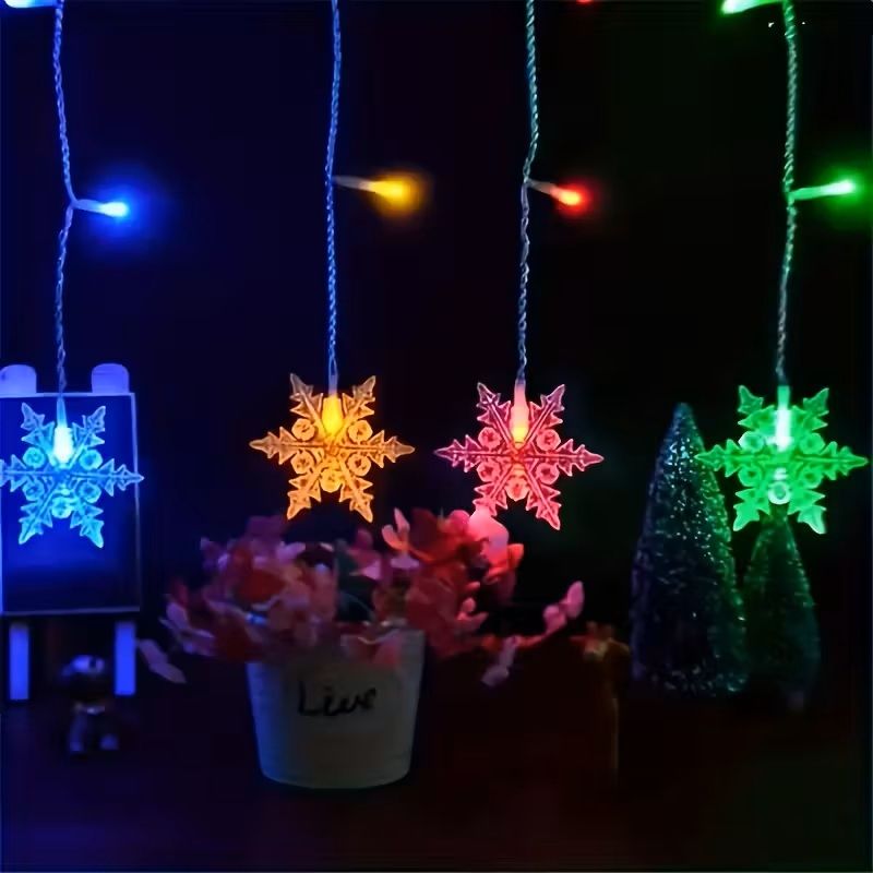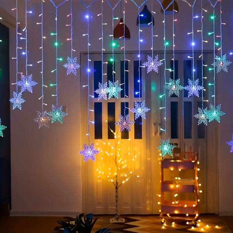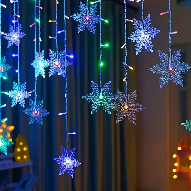 Эта светодиодная гирлянда-штора с фигурками снежинок и длиной 4×0,7 м, работающая от сети 220 V создаёт яркое многоцветное свечение и идеально подходит для оформления окон, стен, витрин и новогоднего декора в доме или офисе.