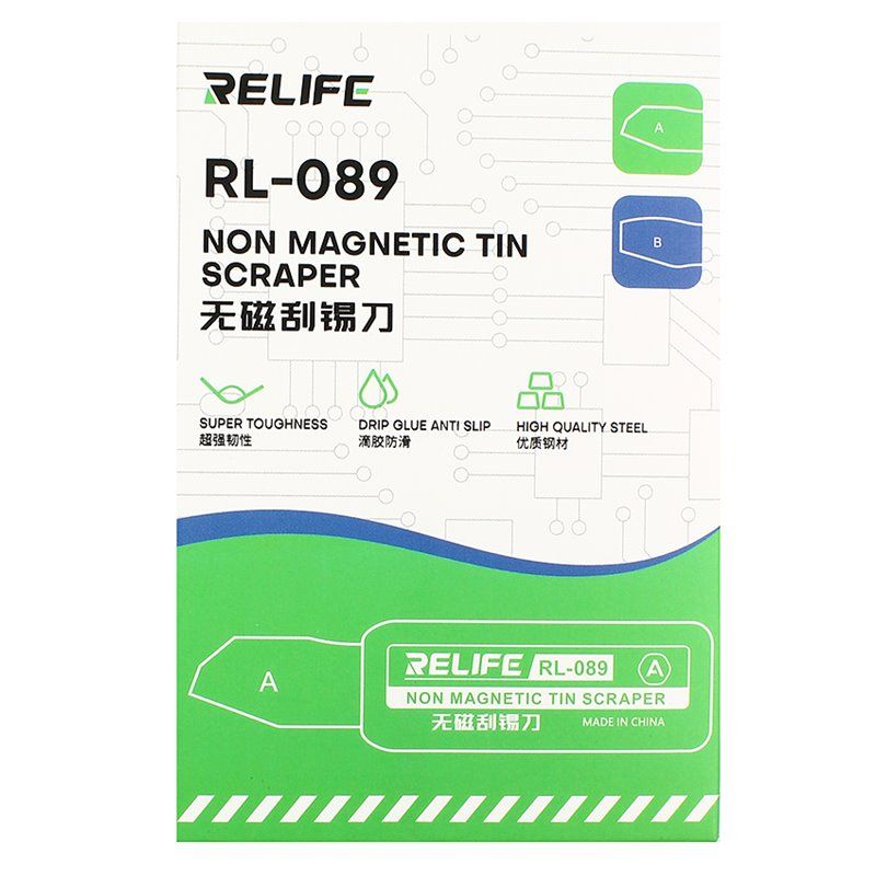 Набор Relife RL-089 – это пара профессиональных немагнитных скребков-лопаток, разработанных для точной работы с материнскими платами, CPU и микросхемами, а также для аккуратного поддевания дисплеев и модулей. Две различные формы лезвий (A и B) позволяют выбирать оптимальный угол и площадь контакта при снятии припоя, клея или разделении склеенных деталей корпуса. Немагнитный сплав и тонкое, но прочное лезвие обеспечивают безопасную работу рядом с мелкими SMD-компонентами и контактными площадками.