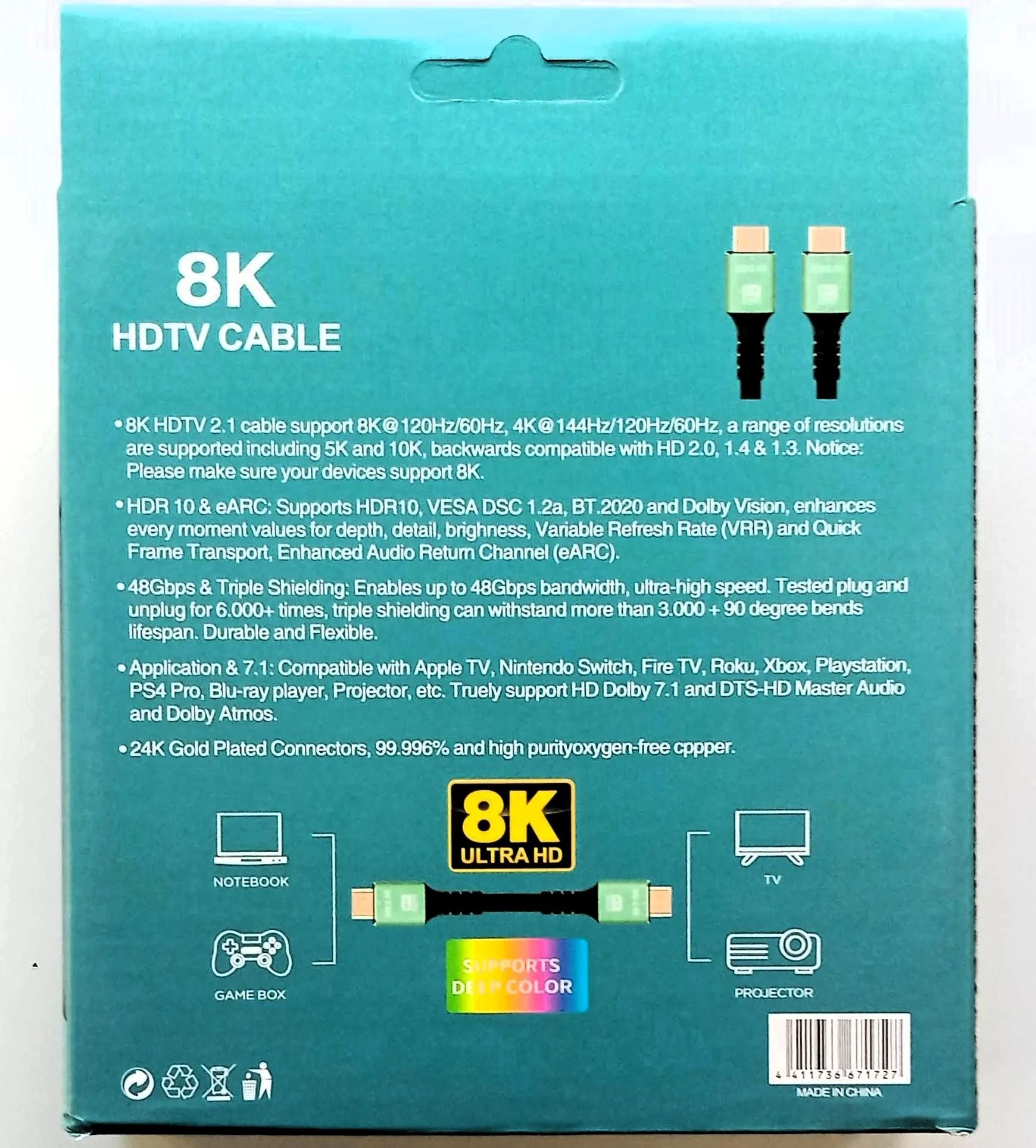 Этот кабель поддерживает самые современные технологии передачи контента, включая 8K 120Hz, улучшенное цветовое кодирование Deep Color, VRR, а также усовершенствованные аудиоформаты через eARC.