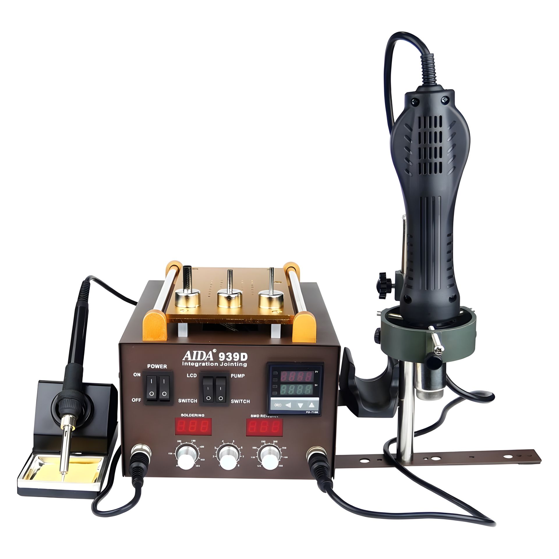 Паяльная станция Aida 939D с вакуумным сепаратором 9" (20x11 см), феном, паяльником и третьей рукой