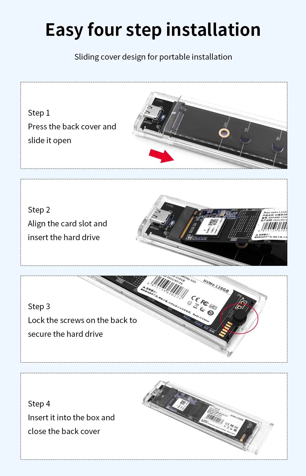 Этот внешний карман предназначен для подключения твердотельных накопителей M.2 NVMe к компьютерам, ноутбукам, мобильным устройствам и другим совместимым устройствам через интерфейс Type-C. Он поддерживает современные протоколы передачи данных, обеспечивает высокую скорость работы и удобную установку без сложных инструментов.