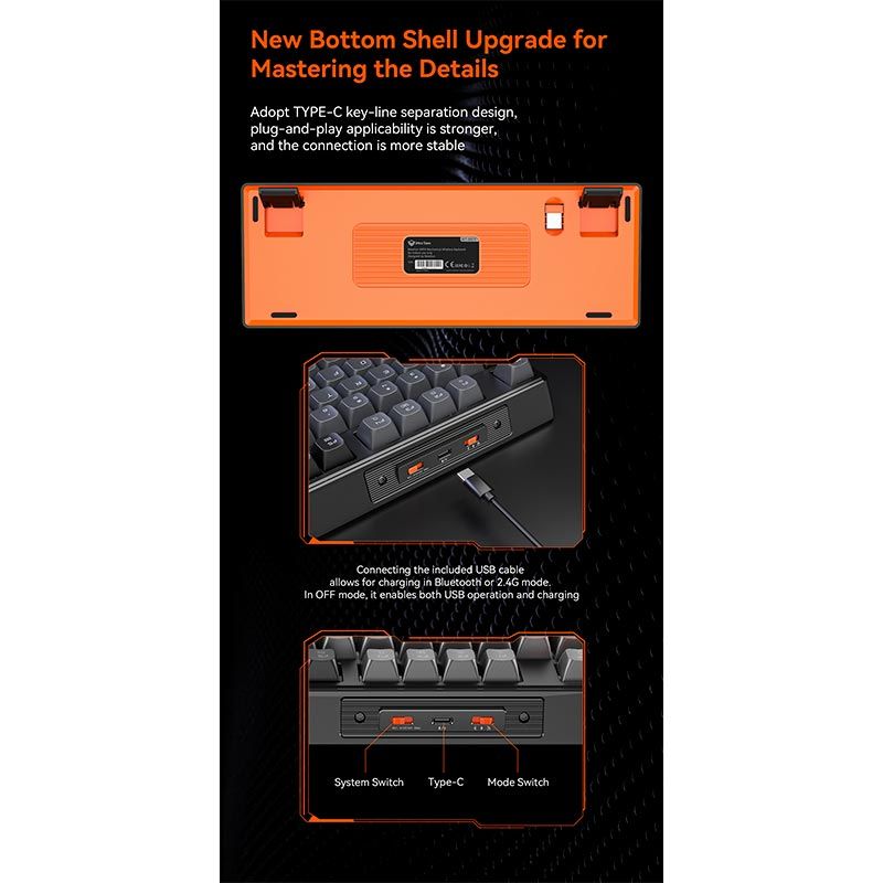 - Поддержка Bluetooth 5.0, беспроводного соединения 2,4 ГГц и проводного подключения через Type-C позволяет использовать клавиатуру с компьютерами, ноутбуками, планшетами и смартфонами, а также быстро переключаться между устройствами.