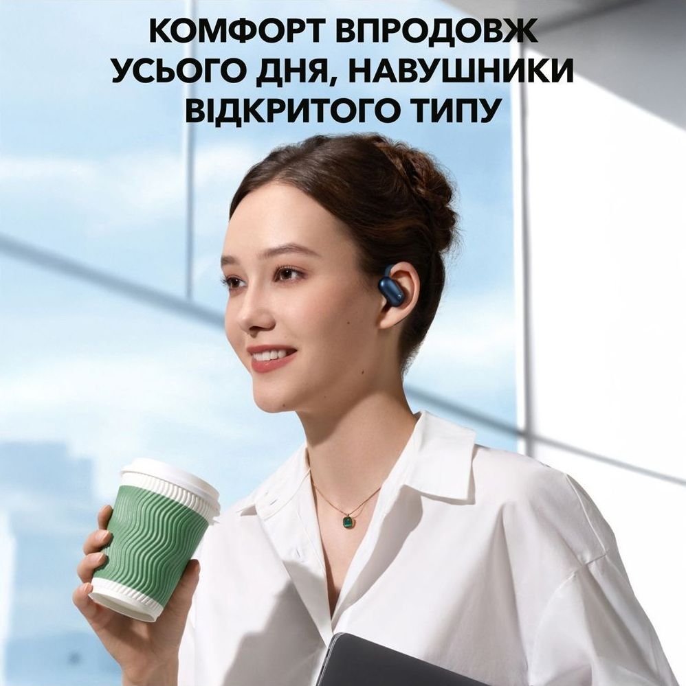 - Открытая конструкция с технологией воздушной проводимости не создает давления на слуховой канал. Двойная изогнутая поверхность и мягкие регулируемые ушные дужки обеспечивают индивидуальную посадку и комфорт даже при многочасовом ношении.