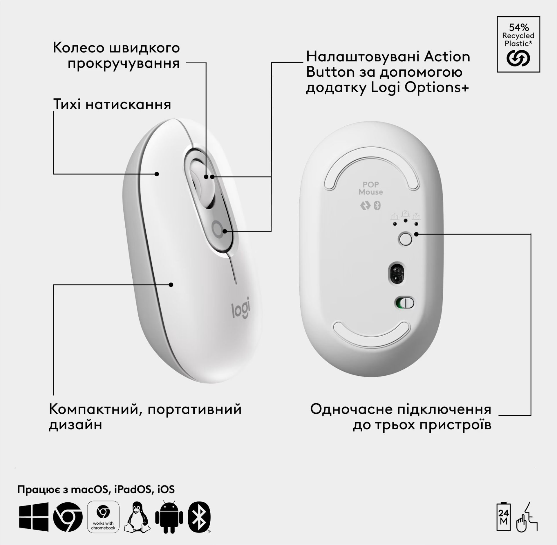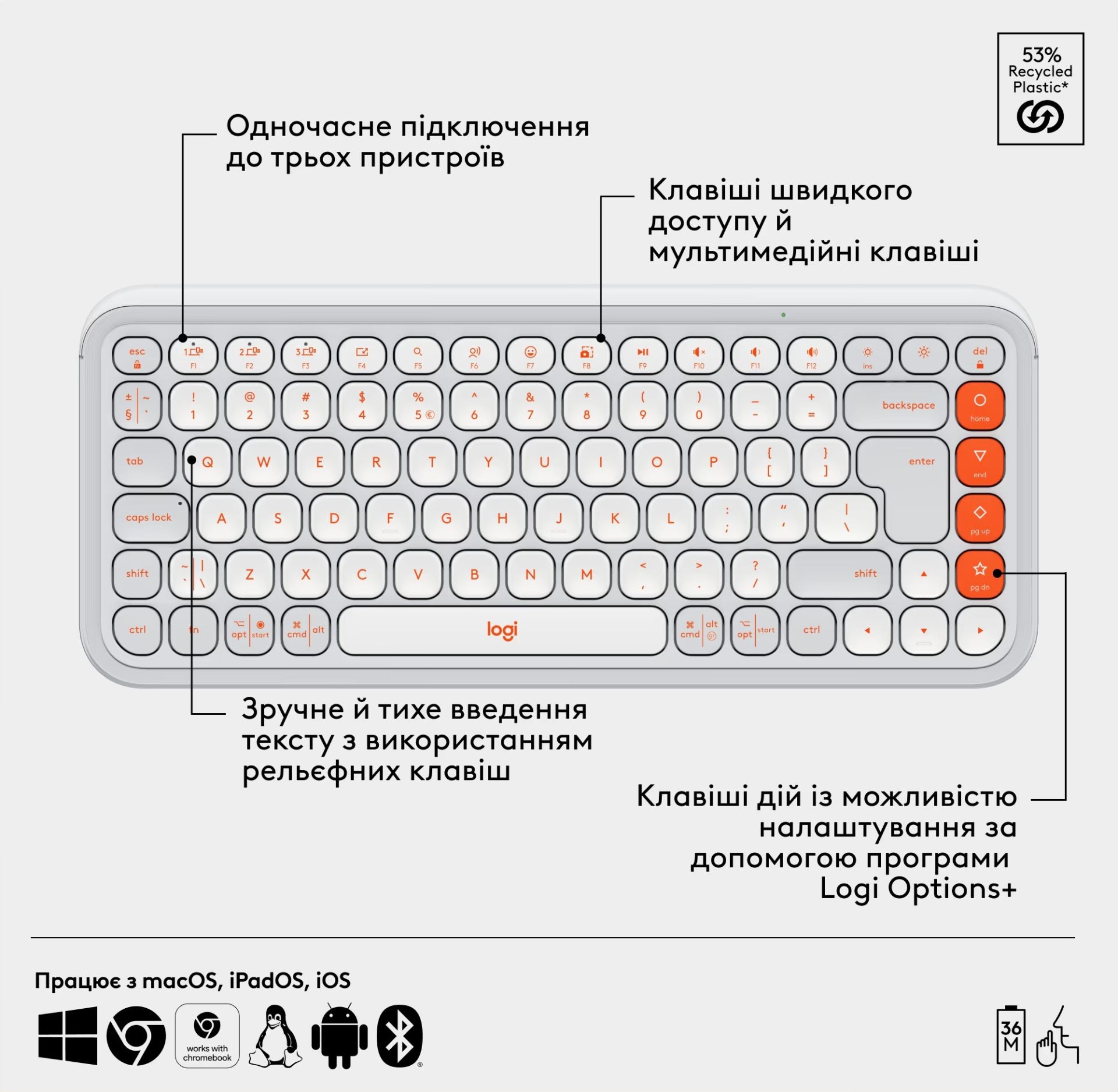 - Клавиатура и мышь поддерживают одновременное подключение до трех устройств по Bluetooth. Переключение между Windows, МacOS, iPadOS, iOS, Android и ChromeOS осуществляется одной кнопкой, что делает комплект идеальным для мультизадачной работы.