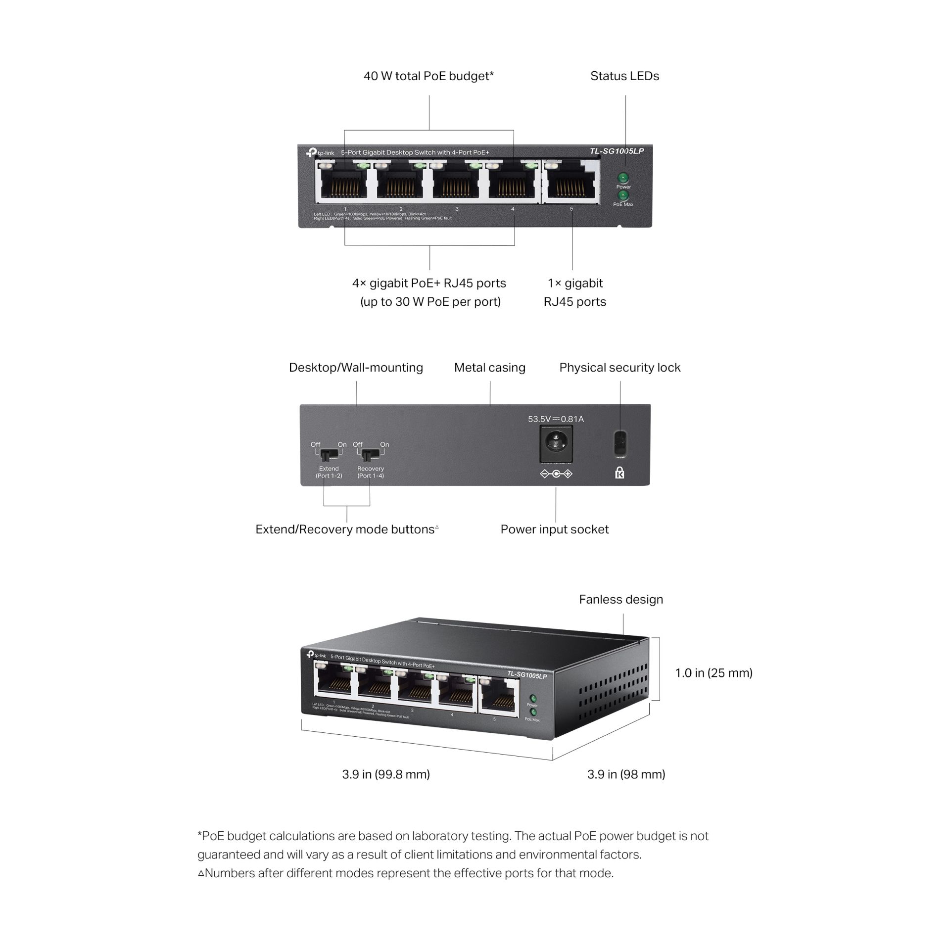 - Оснащен 5 гигабитными портами Ethernet, из которых 4 поддерживают технологию PoE+, позволяя одновременно передавать данные и питание по одному сетевому кабелю.