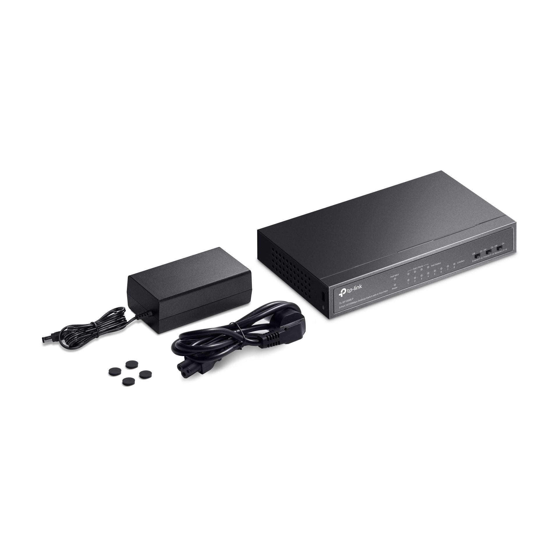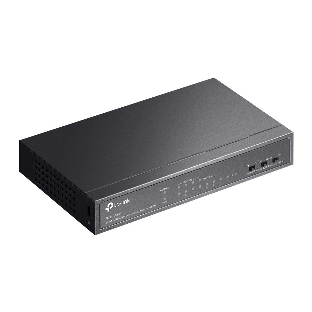 - TL-SF1008LP оснащен 8 портами 10/100 Мбит/с, из которых 4 поддерживают PoE+ по стандарту IEEE 802.3af/at. Каждый PoE-порт может обеспечивать до 30 Вт, общий PoE-бюджет составляет 41 Вт. Это делает устройство идеальным для подключения IP-камер, точек доступа, IP-телефонов, видеорегистраторов и другого сетевого оборудования.