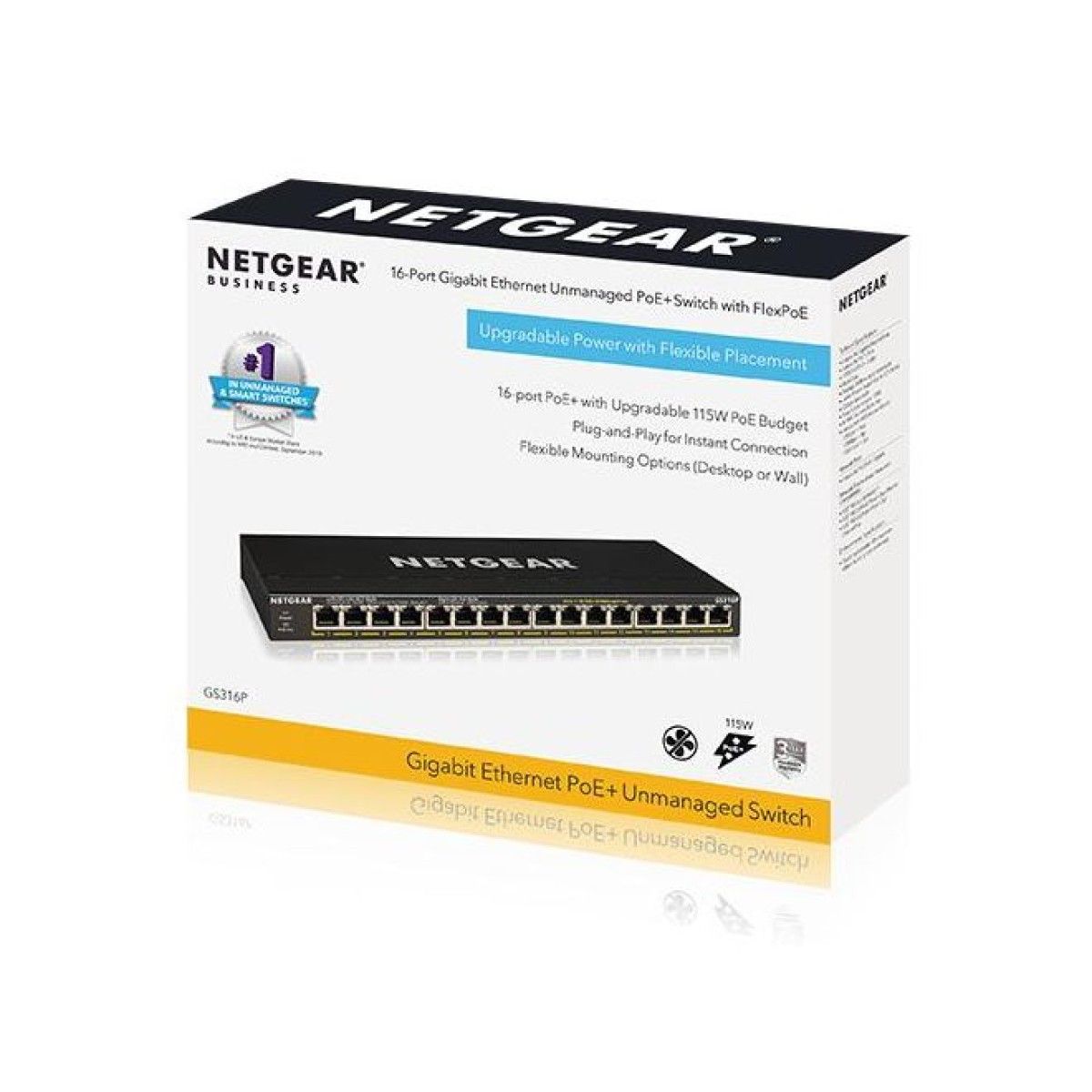 NETGEAR GS316P 16-портовый неуправляемый PoE+ коммутатор (115Вт), FlexPoE