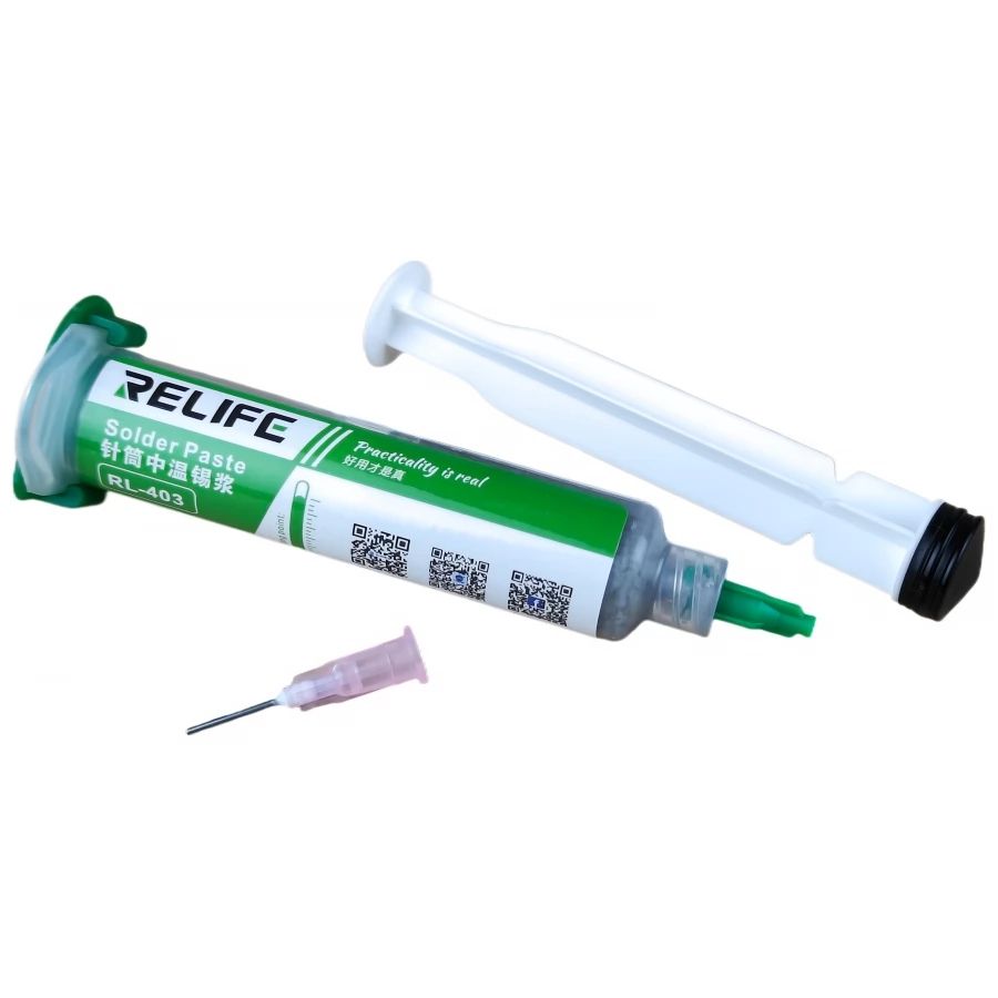 Relife RL-403 — это профессиональная паяльная паста с флюсом для точечной пайки электронных компонентов и реболлинга BGA-микросхем. Изготовлена на основе классического олова-свинца (сплав Sn63/Pb37) с температурой плавления 183 °C. Продукт поставляется в удобном шприце с объемом 10 мл, что обеспечивает удобное, чистое и точное нанесение материала на контактные площадки перед пайкой. Эта паста предназначена для ремонта и монтажа электронных плат, включая мобильные устройства, ПК-оборудование, контроллеры и другие SMT/BGA-схемы.
