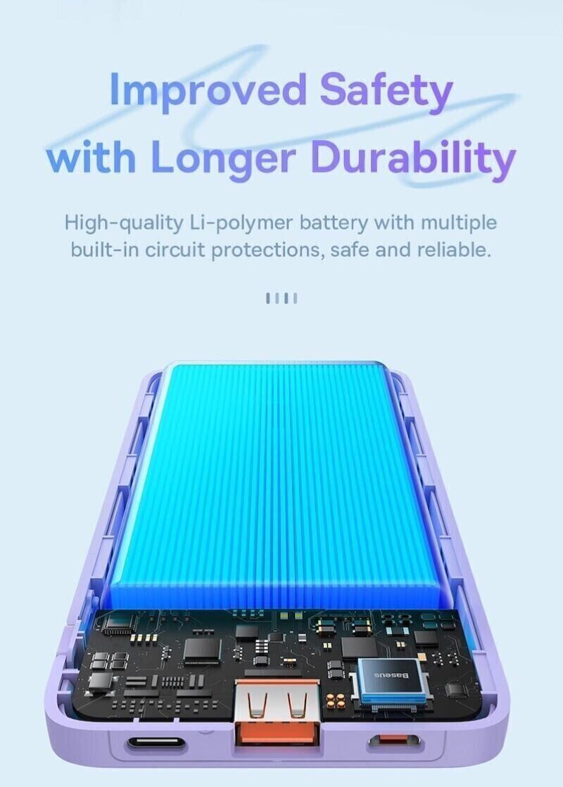 Baseus Airpow — это компактный, стильный и высокоэффективный повербанк, предназначенный для быстрой и безопасной зарядки современных мобильных устройств. Эта модель сочетает в себе оптимальную ёмкость, поддержку популярных стандартов быстрой зарядки и продуманный эргономичный дизайн, что делает её отличным выбором для повседневного использования, поездок и путешествий.