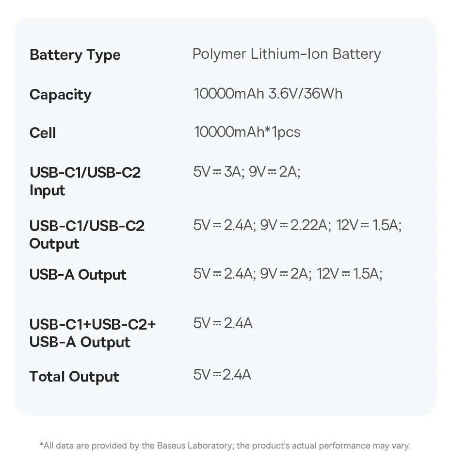 - Совместный выход (Type-C1 + Type-C2 + USB-A): 5 V ⎓ 2.4 A
