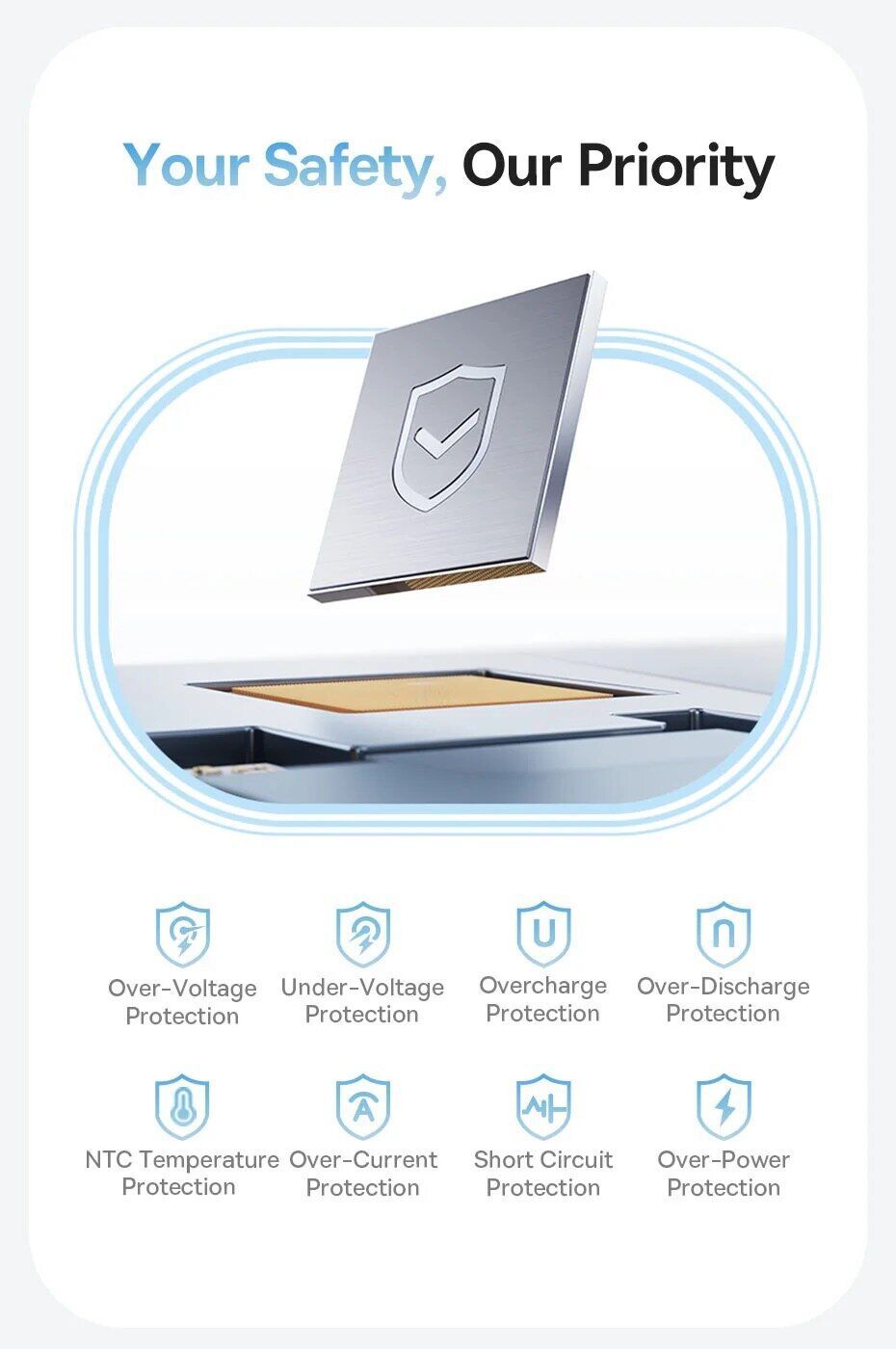 - Встроенные 8 уровней интеллектуальной защиты предотвращают перегрев, перенапряжение, перезаряд, короткое замыкание и перегрузку по току.