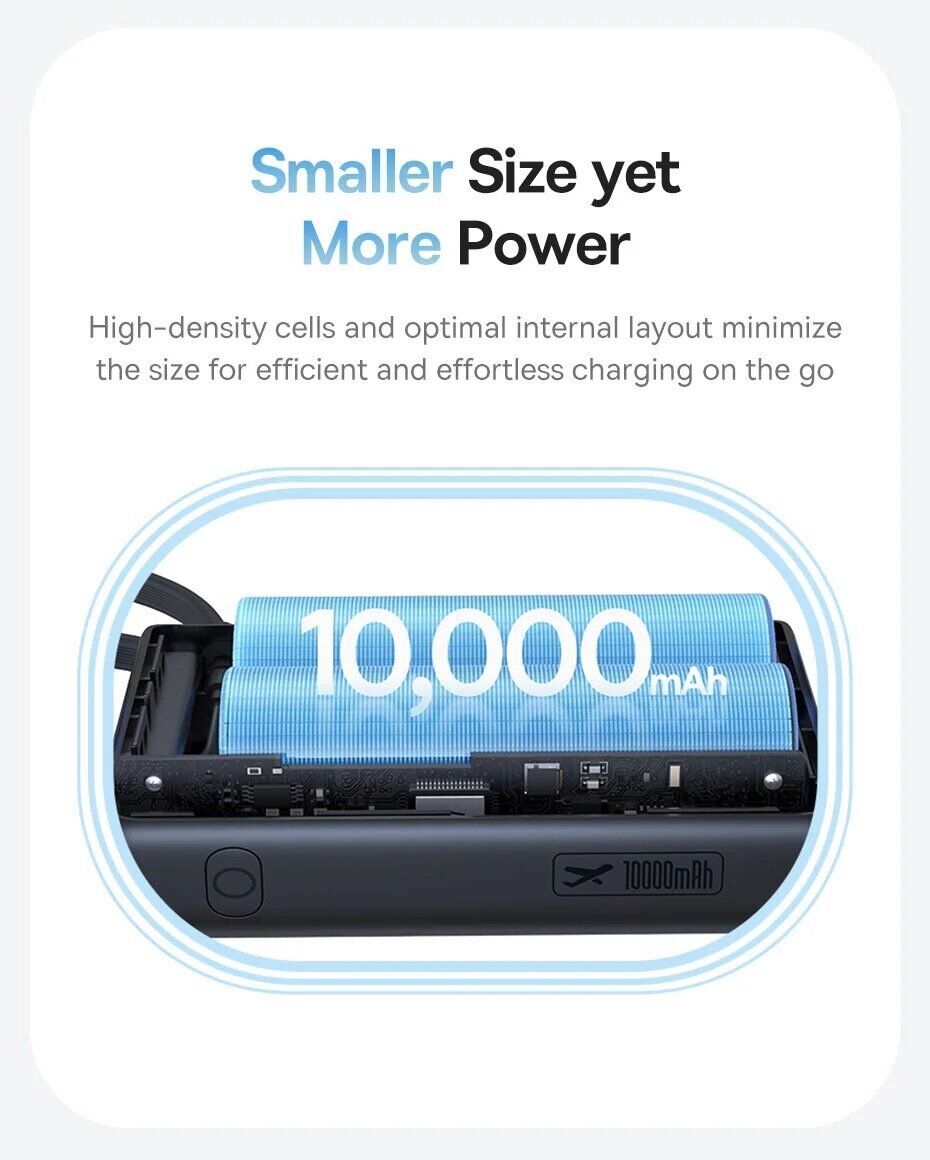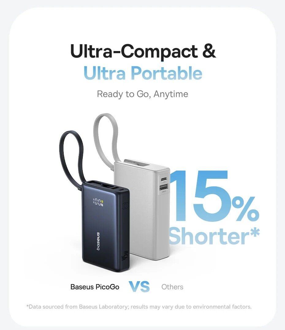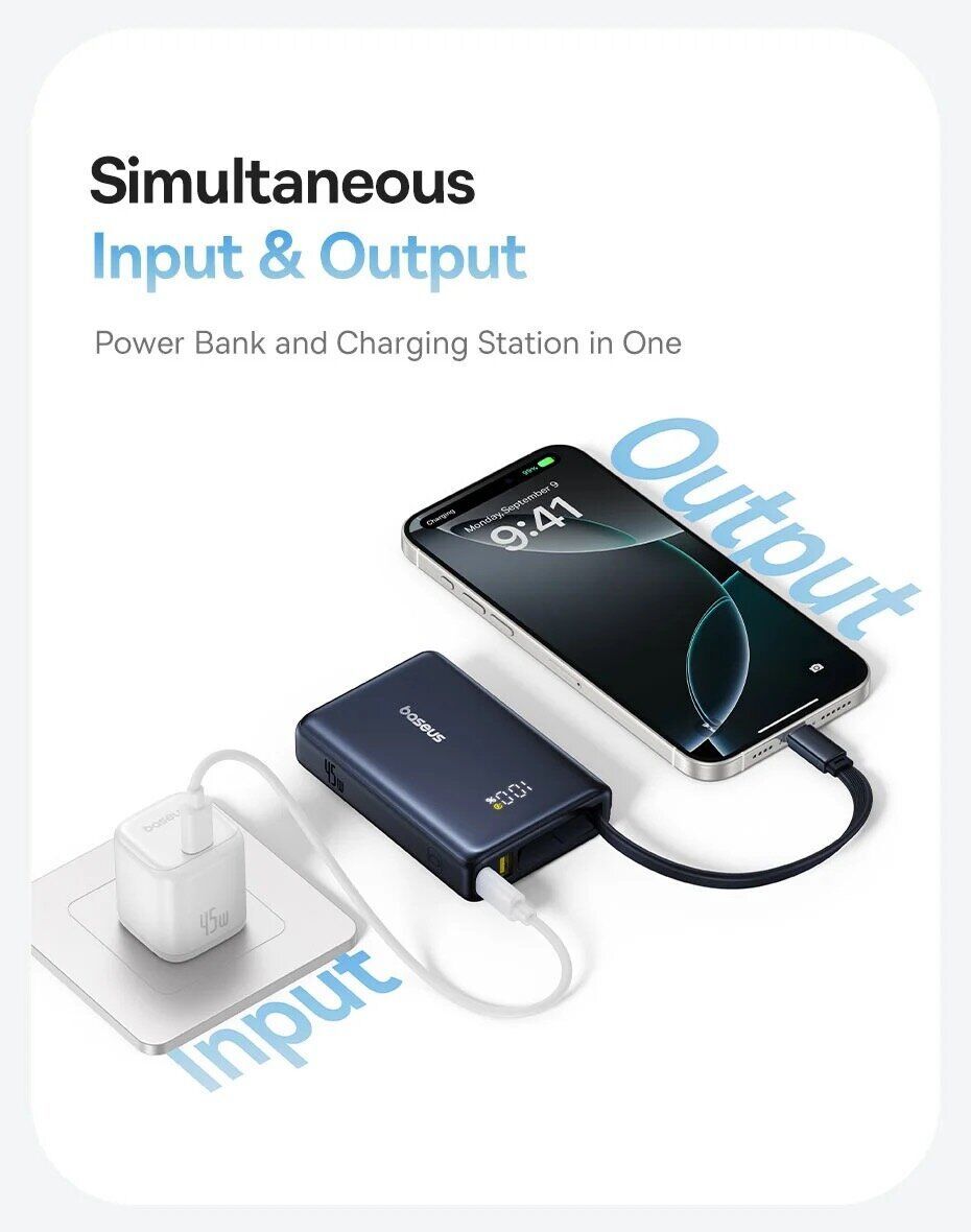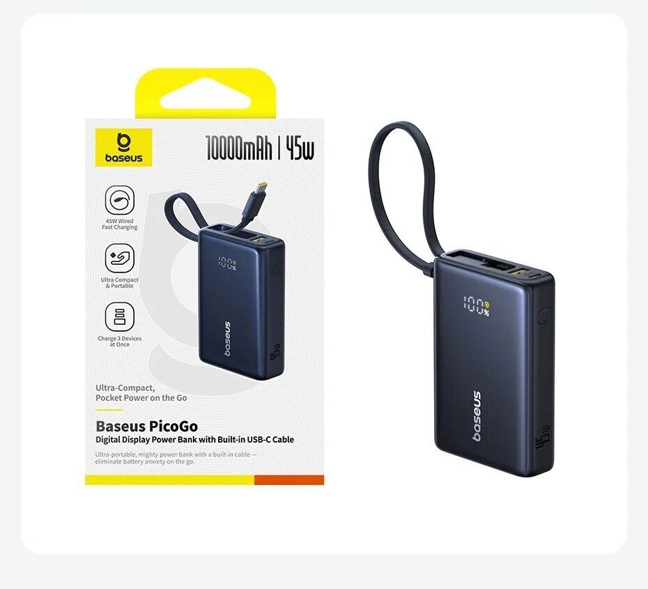 Baseus PicoGo 45W — это компактный, мощный и технологичный повербанк нового поколения, предназначенный для быстрой и безопасной зарядки современных мобильных устройств. Модель сочетает ёмкость 10000 мА·ч, высокую выходную мощность до 45 Вт, поддержку актуальных стандартов быстрой зарядки и встроенный кабель с разъемом Type-C, что делает его универсальным решением для дома, офиса и путешествий.
