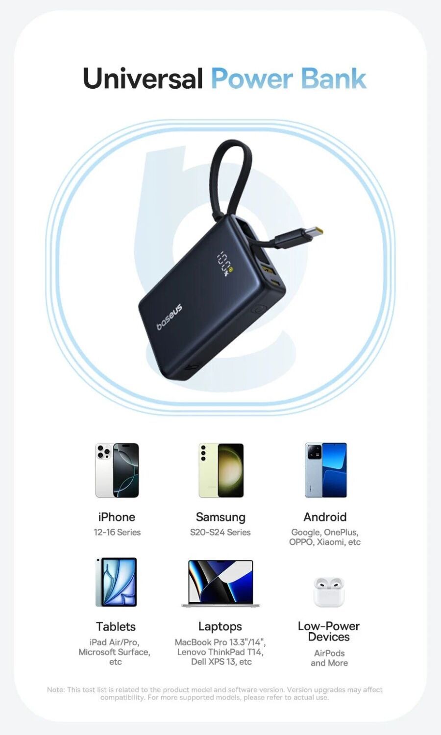 - Этот повербанк подходит для зарядки устройств на iOS, Android и других платформах, включая смартфоны, планшеты, беспроводные колонки и аксессуары.