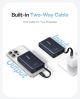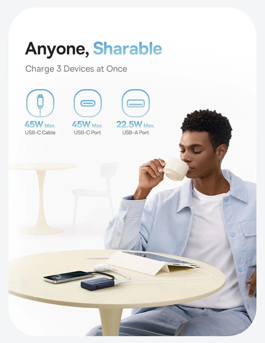- Наличие USB-A, Type-C порта и встроенного кабеля с разъемом Type-C позволяет подключать до трех гаджетов одновременно, что особенно удобно в дороге или при активном использовании нескольких устройств.