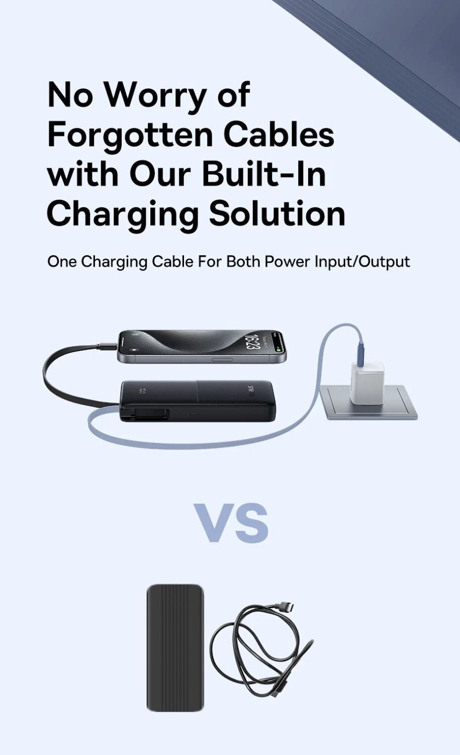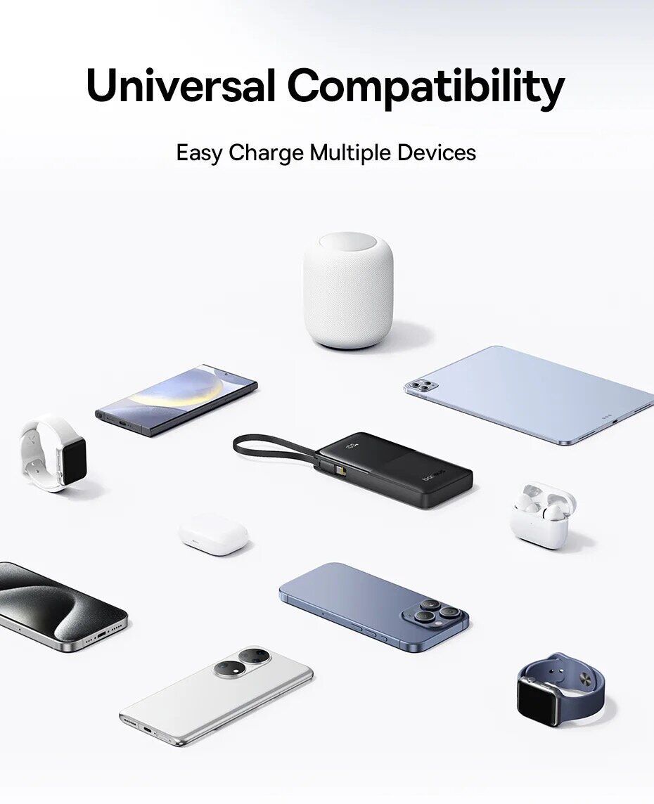 - USB-A порт, Type-C порт и встроенный кабель с разъемом Type-C позволяют подключать сразу несколько гаджетов, включая смартфоны, наушники, беспроводные колонки и аксессуары.