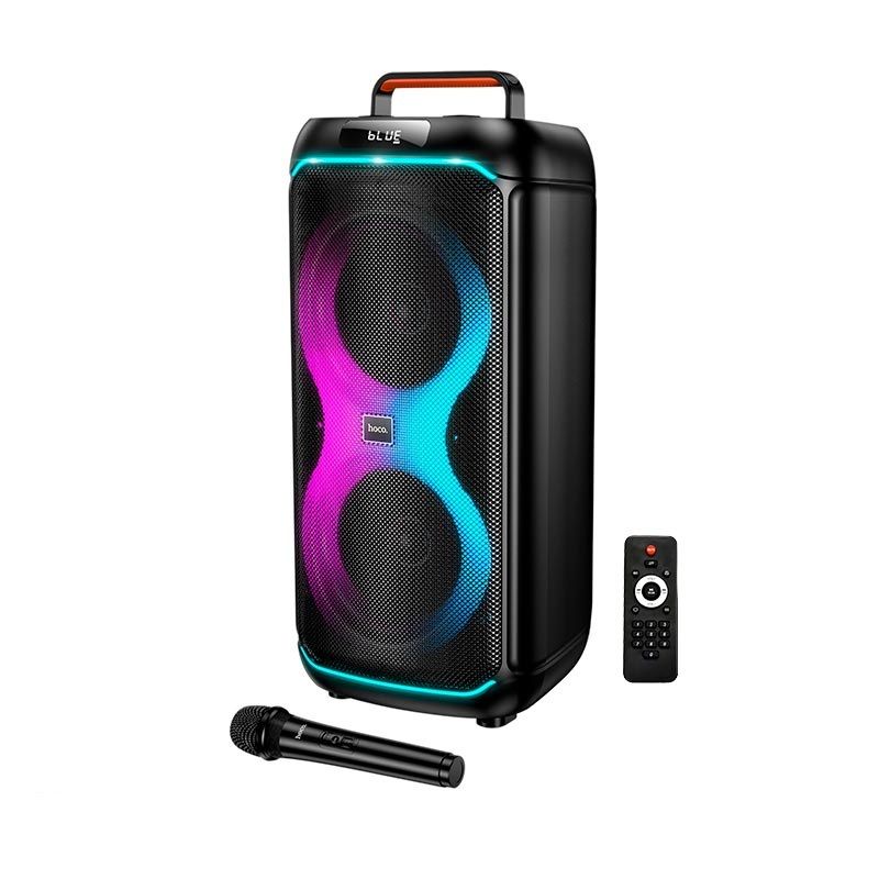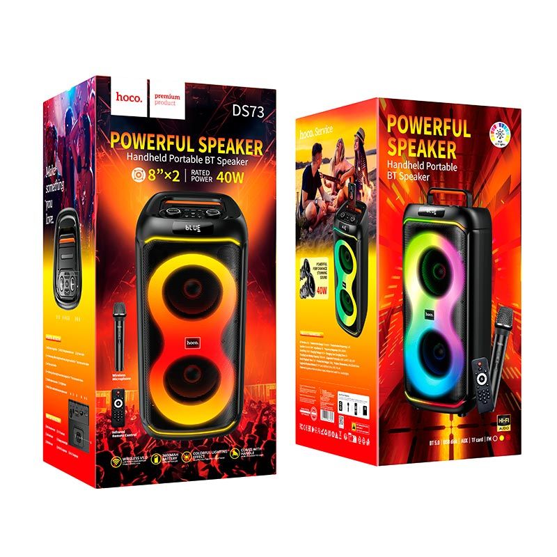 HOCO DS73 — этомощнаяпортативнаяакустическаясистемаформата party speaker, созданнаядлявечеринок, караоке, тренировок, выездовнаприроду и мероприятий. Эта модельоснащенадвумякрупными 8-дюймовыми динамиками, яркой RGB-подсветкой, беспроводныммикрофоном и пультомдистанционногоуправления, благодарячему эта колонкавыступаетполноценнымцентромразвлечений.