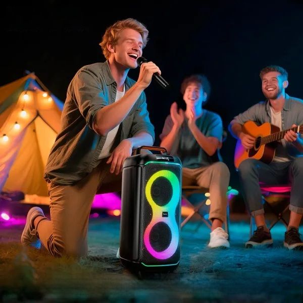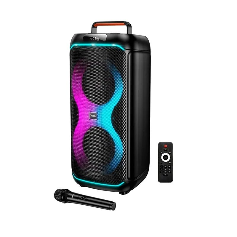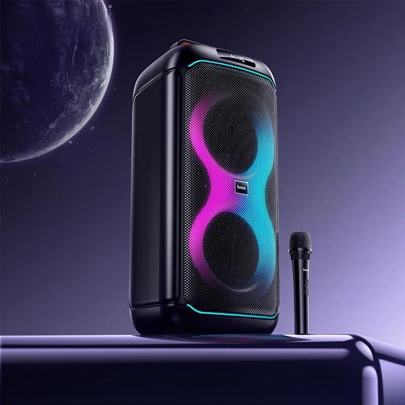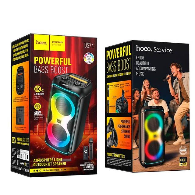 HOCO DS74 — это мощнаяпортативнаяакустическаясистемаформата party speaker, предназначеннаядлявечеринок, караоке, мероприятий, тренировок и активногоотдыханаприроде. Эта модельоснащенадвумя 6.5-дюймовыми динамиками, яркой RGB-подсветкой, беспроводныммикрофоном и пультомдистанционногоуправления, чтоделаетеёуниверсальнымрешениемдляразвлечений в любыхусловиях.