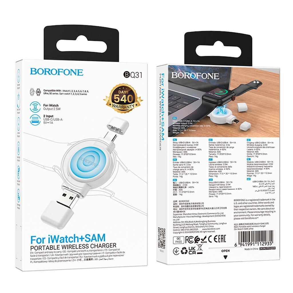 BOROFONE BQ31 — это компактное и универсальное беспроводное зарядное устройство, предназначенное для безопасной и стабильной зарядки смарт-часов Apple Watch и Samsung Galaxy Watch. Модель разработана с учётом мобильного образа жизни и сочетает минималистичный дизайн, высокое качество сборки и удобство повседневного использования.