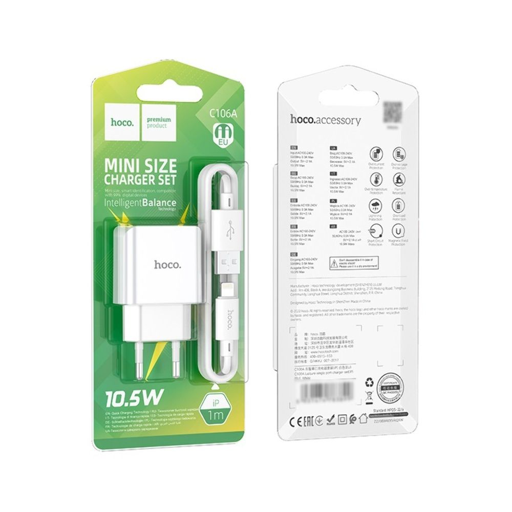 Сетевое зарядное устройство Hoco C106A USB белое + кабель USB to Lightning