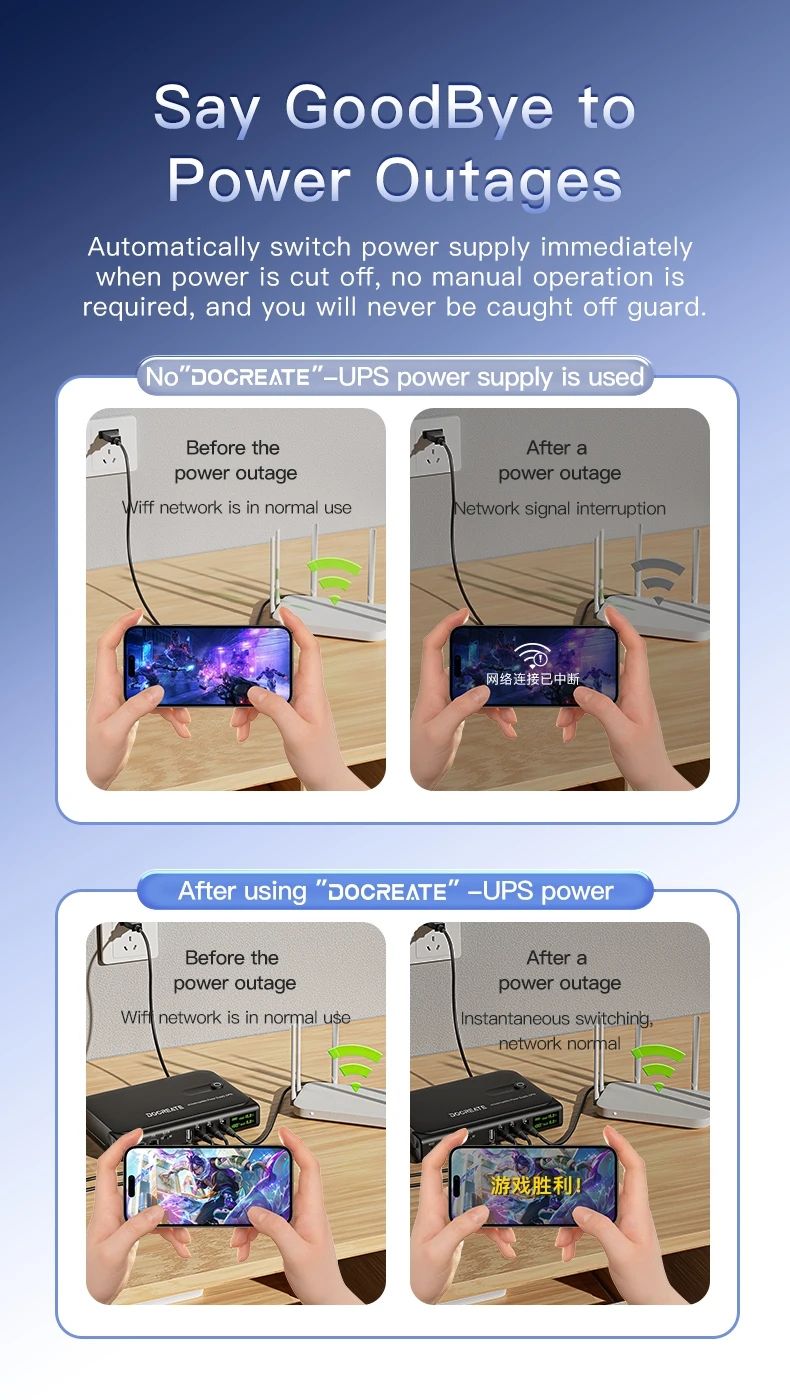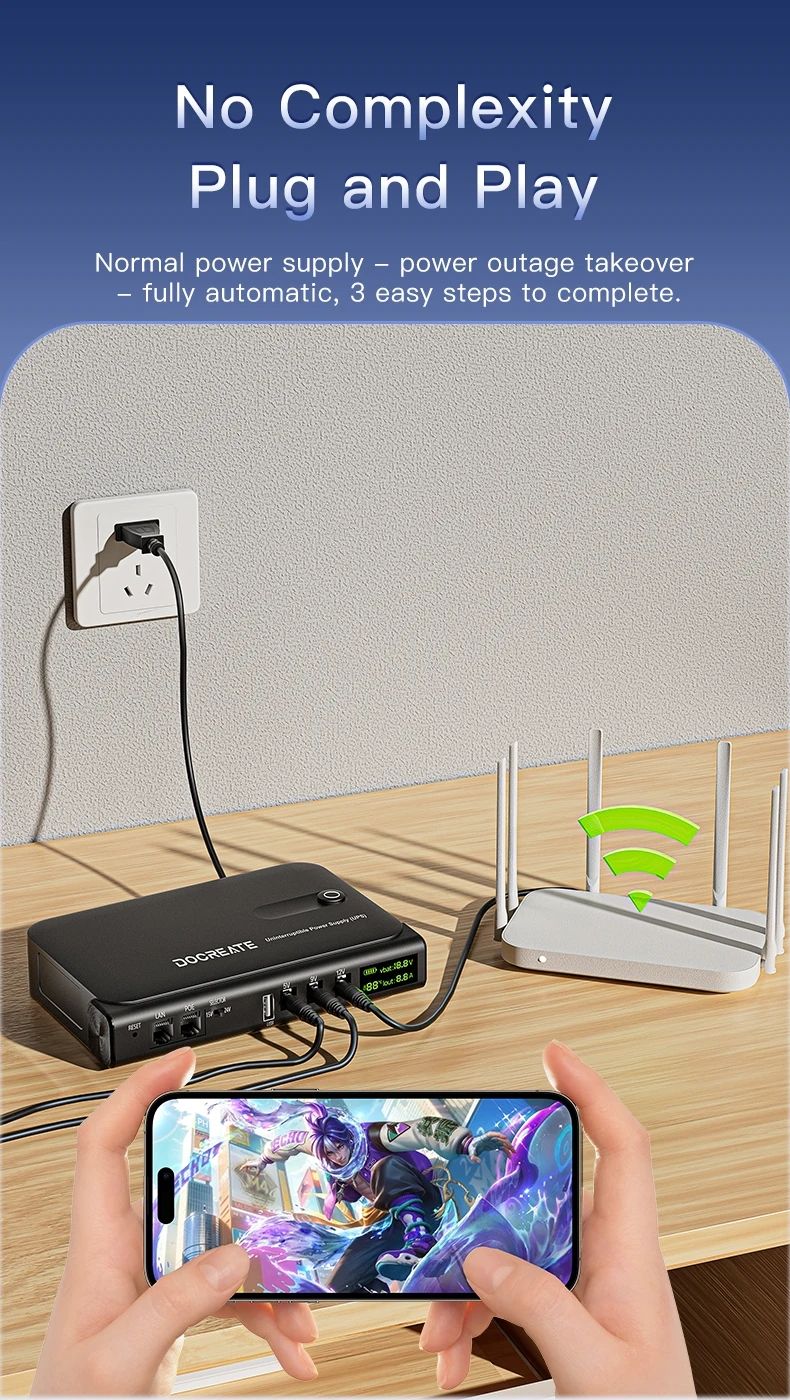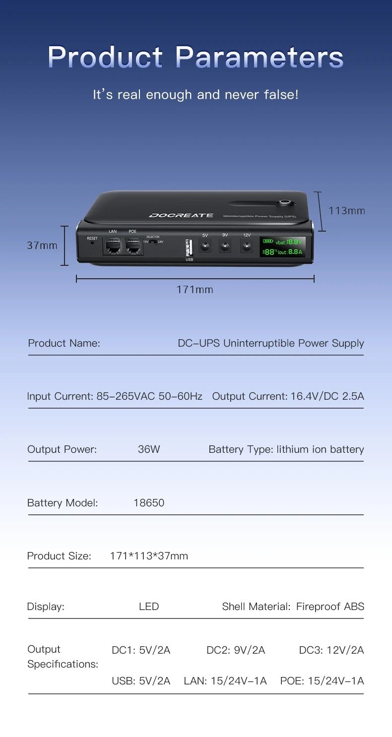 Docreate DC1036L — это компактный линейно-интерактивный DC-UPS для питания роутера, оптического модема, камер видеонаблюдения, свитчей, NAS и других маломощных устройств при перебоях электросети. При пропадании напряжения сеть/Интернет продолжают работать без перезагрузки и обрывов связи, а после восстановления питания ИБП автоматически возвращается в обычный режим. Устройство использует 4 сменные аккумуляторы 18650 (входят в комплект) и оснащено информативным LED-дисплеем, показывающим напряжение, ток, температуру и уровень заряда.
