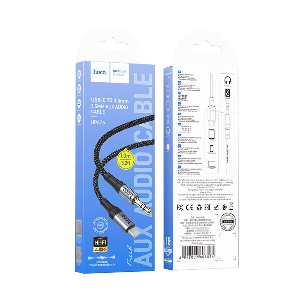 Кабель Hoco UPA26 Type-C to 3.5 мм — это качественный и надежный аудиоаксессуар для подключения устройств с разъемом Type-C к аудиосистемам, наушникам, колонкам и автомобильным магнитолам с входом 3.5 мм (mini-jack). Этот кабель обеспечивает стабильную передачу аудиосигнала без помех и потерь, подходит для повседневного использования дома, в офисе и в автомобиле.