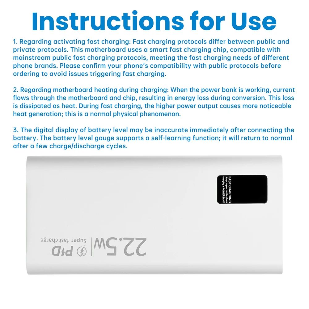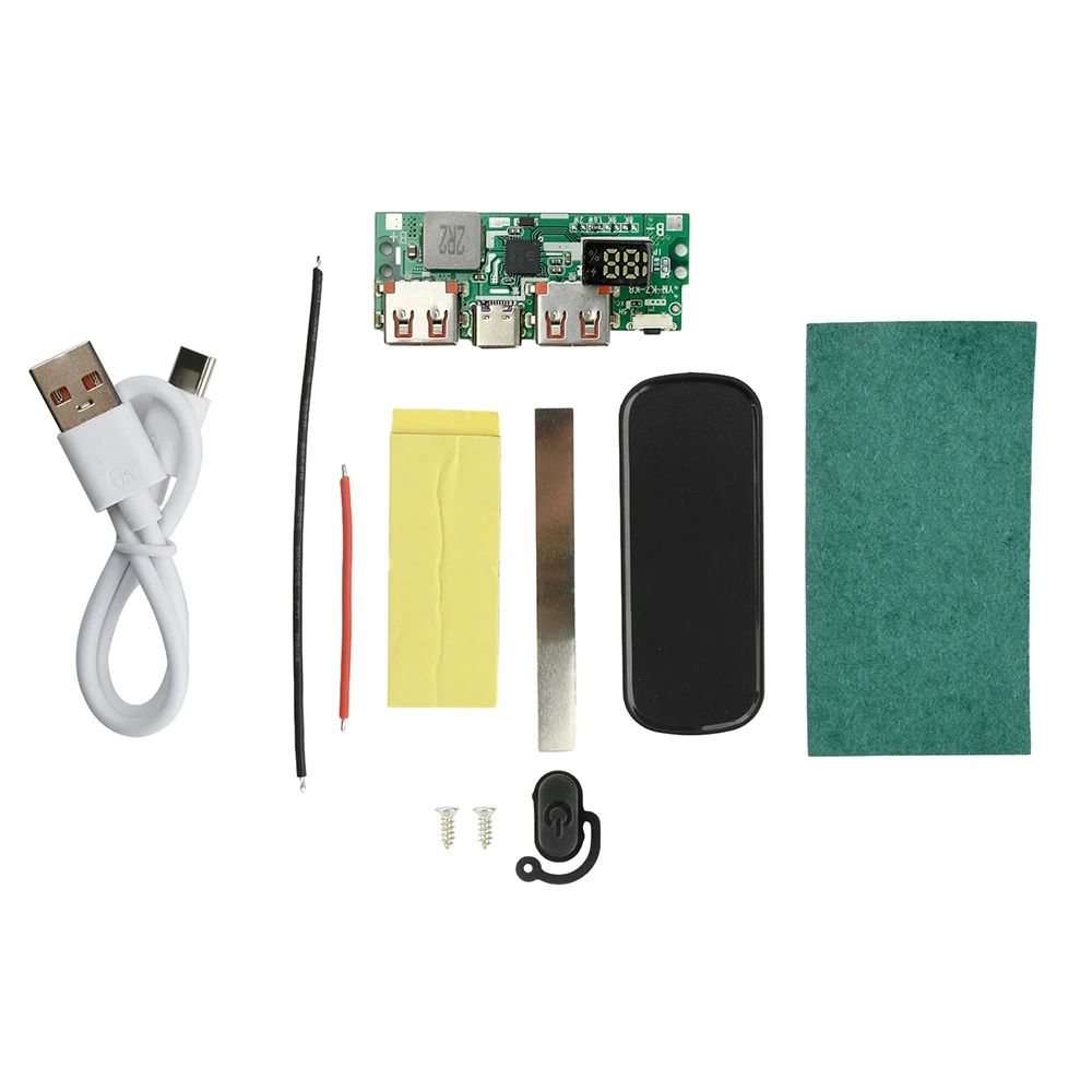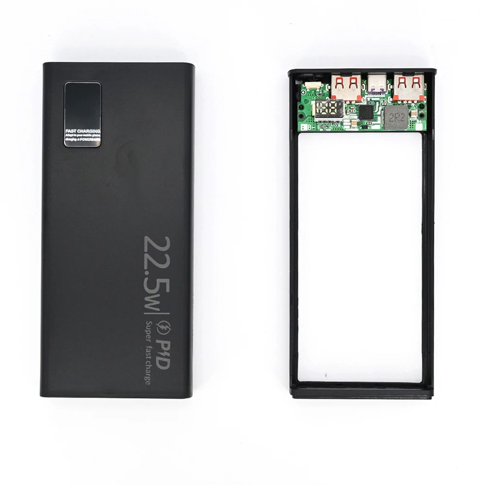Это комплект для самостоятельной сборки внешнего аккумулятора с цифровым дисплеем и поддержкой быстрой зарядки до 22.5 Вт. Предназначен для установки двух литий-полимерных аккумуляторов формата 1260110 (3.7 В) с параллельным подключением.