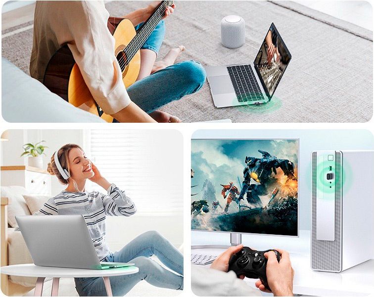 С его помощью можно подключать беспроводные устройства, такие как наушники, колонки, мыши, клавиатуры и мобильные телефоны, на расстоянии до 20 метров без потерь качества. Этот адаптер поддерживает одновременное подключение до 5 устройств, позволяя легко переключаться между ними для работы, учебы, игр или развлечений.