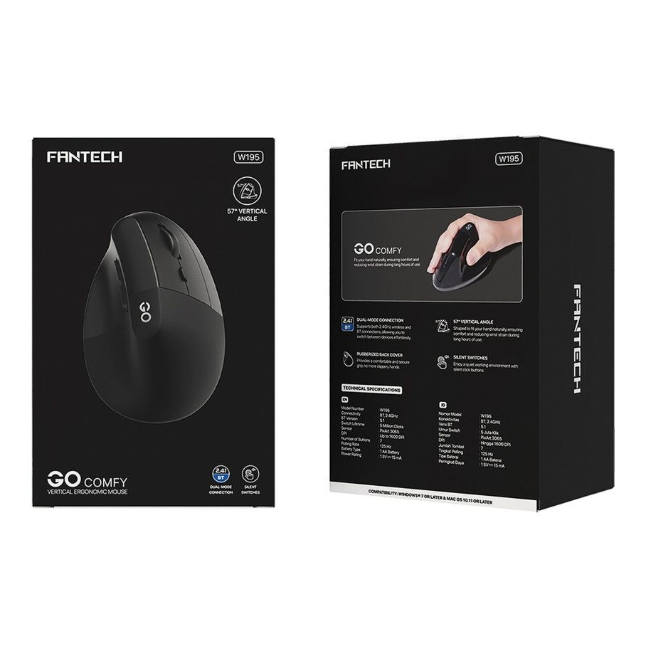 Беспроводная мышь Fantech GO W195 — это современное устройство с вертикальным эргономичным дизайном, созданное для комфортной и эффективной работы за компьютером. Модель сочетает продуманную форму корпуса, высокую точность позиционирования и возможность двойного беспроводного подключения, что делает её универсальным инструментом для повседневного использования дома, в офисе или во время работы с несколькими устройствами.