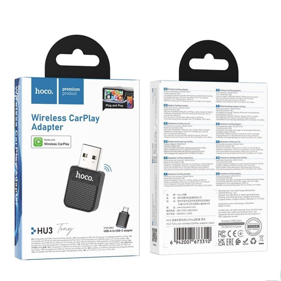 Hoco HU3 — это компактный автомобильный адаптер, предназначенный для преобразования проводного Apple CarPlay в беспроводной режим. Устройство позволяет подключать iPhone к мультимедийной системе автомобиля без использования кабеля, обеспечивая удобный доступ к навигации, музыке, звонкам и другим функциям смартфона прямо на экране автомобиля.