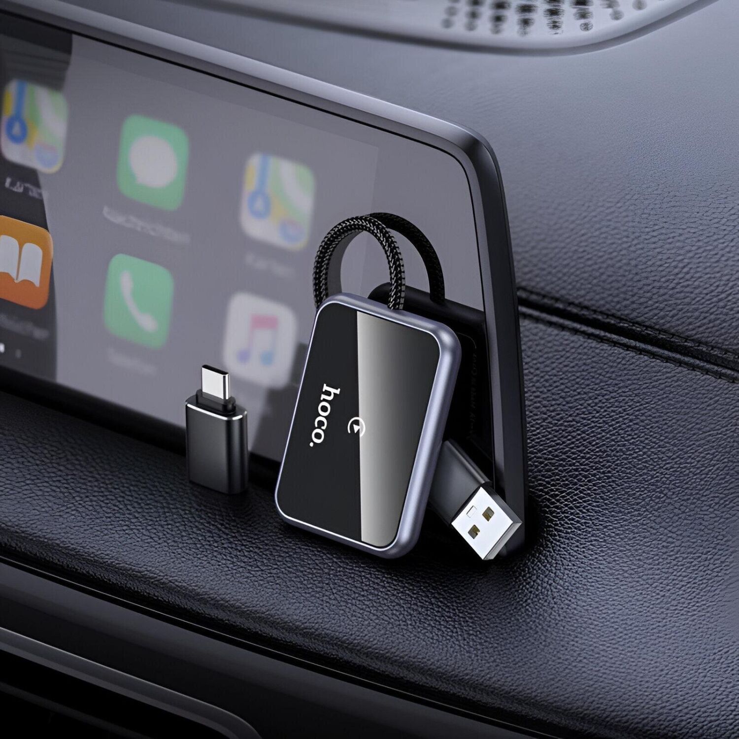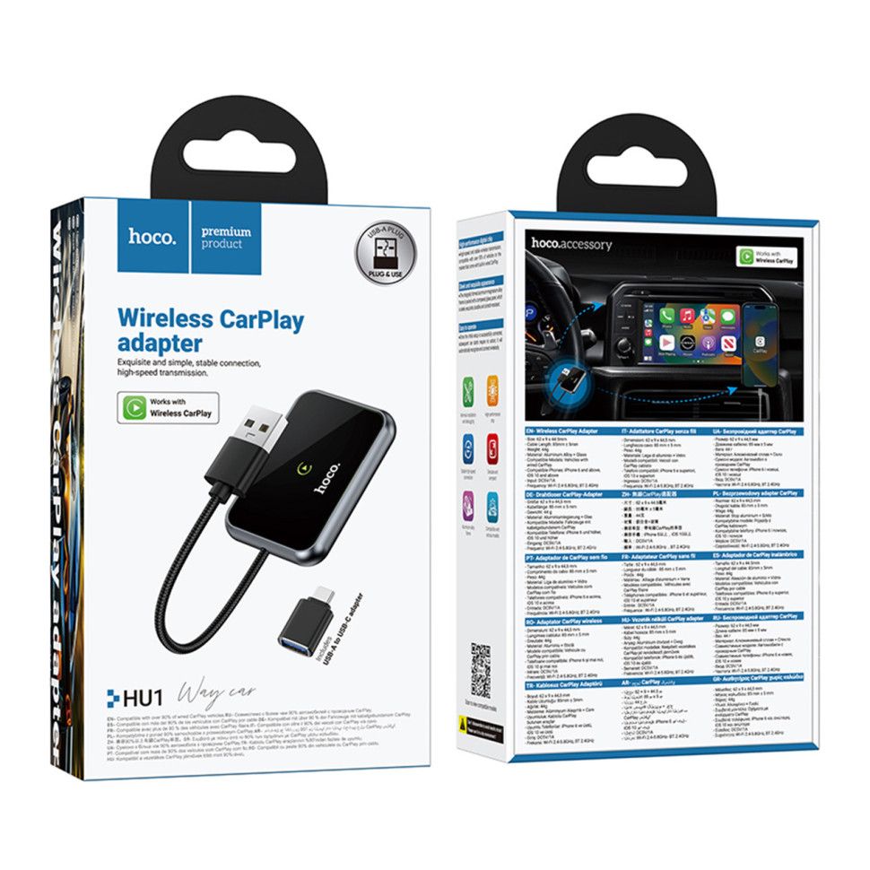 Hoco HU1 — это современный автомобильный адаптер, предназначенный для преобразования проводного Apple CarPlay в беспроводной режим. Устройство позволяет подключать iPhone к мультимедийной системе автомобиля без использования кабеля, обеспечивая быстрый доступ к навигации, звонкам, сообщениям и мультимедиа прямо с экрана автомобильной системы.