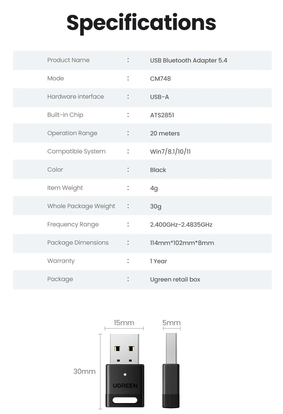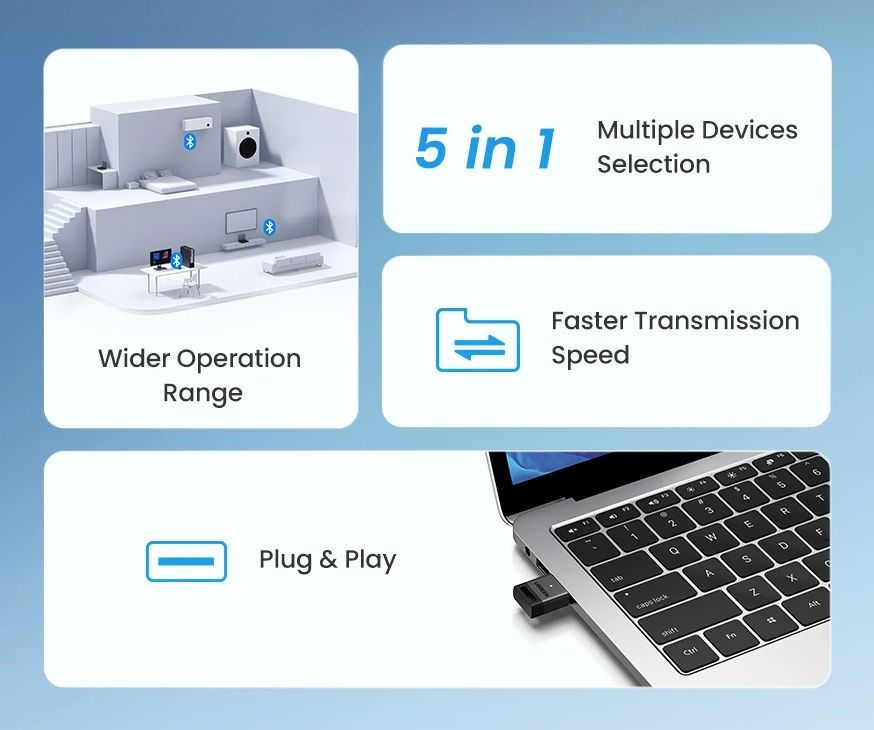 USB Bluetooth адаптер Ugreen CM748 — это компактное устройство, предназначенное для добавления функции Bluetooth к настольному компьютеру или ноутбуку. Этот адаптер обеспечивает стабильное беспроводное соединение с различными устройствами, такими как наушники, колонки, клавиатуры, мыши, игровые контроллеры и другие Bluetooth-аксессуары.