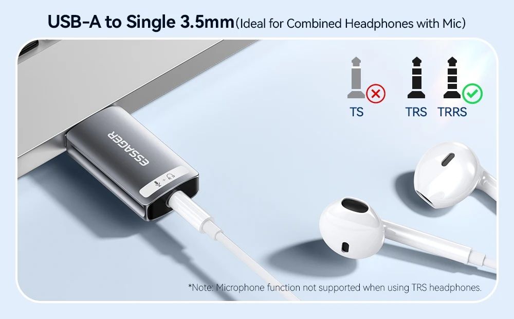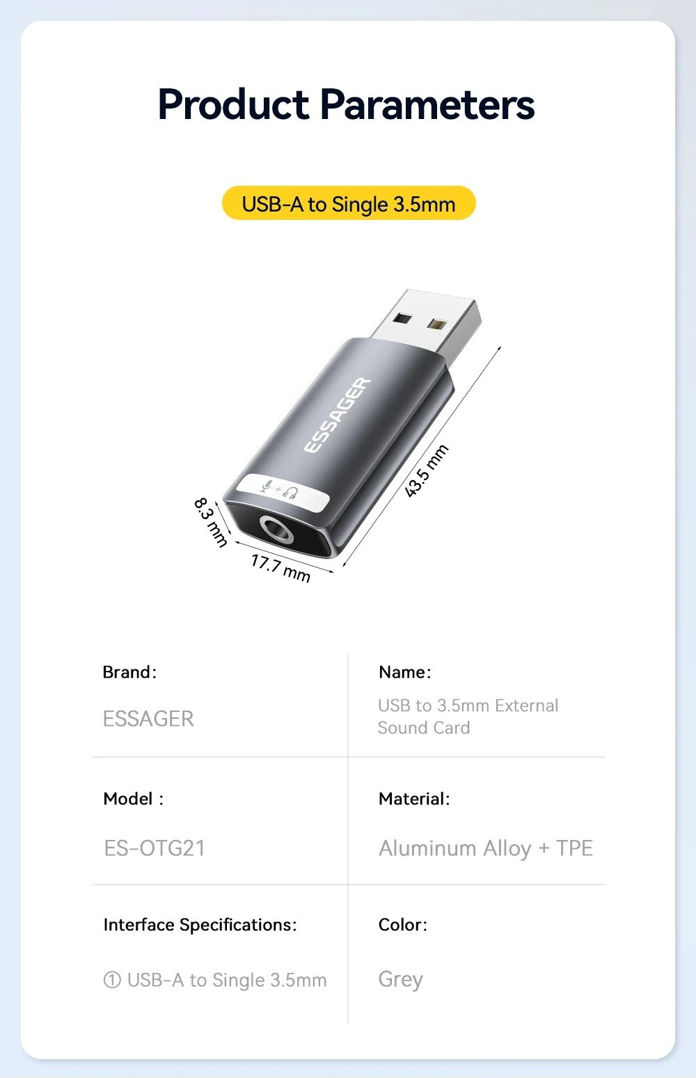 Внешняя звуковая карта Essager USB to 3.5 mm Jack (1×TRRS) — это компактный и универсальный аудиоадаптер, предназначенный для подключения наушников, гарнитуры или микрофона к устройствам, оснащённым USB-портом. Аксессуар позволяет быстро добавить аудиоразъём 3.5 мм на компьютеры, ноутбуки, игровые консоли и другие устройства, обеспечивая стабильное и качественное воспроизведение звука.