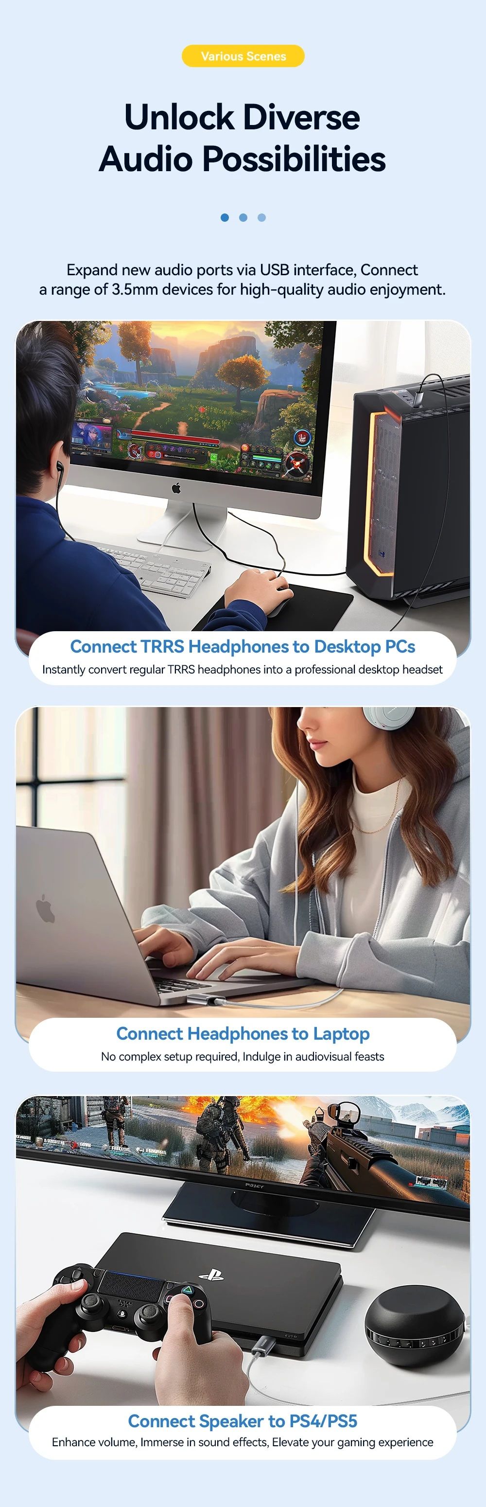 Модель оснащена современным аудиочипом обработки сигнала, который обеспечивает высокую четкость звучания, минимальные задержки и стабильную передачу голоса во время звонков, игр и онлайн-конференций. Благодаря поддержке комбинированного разъёма TRRS этот адаптер одновременно работает с наушниками и микрофоном через один 3.5 мм порт, что делает его удобным решением для гарнитур.
