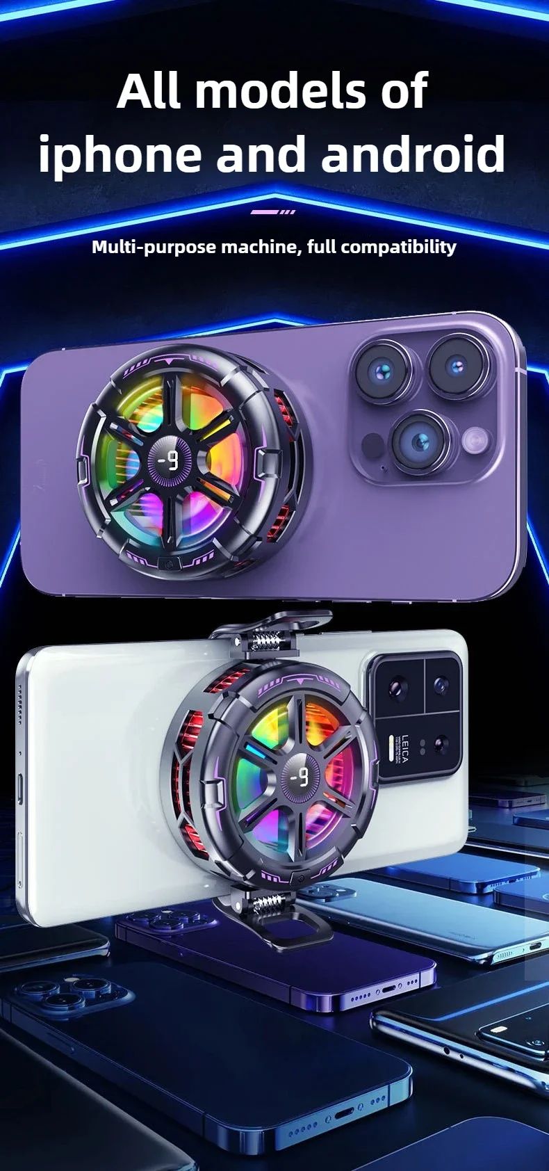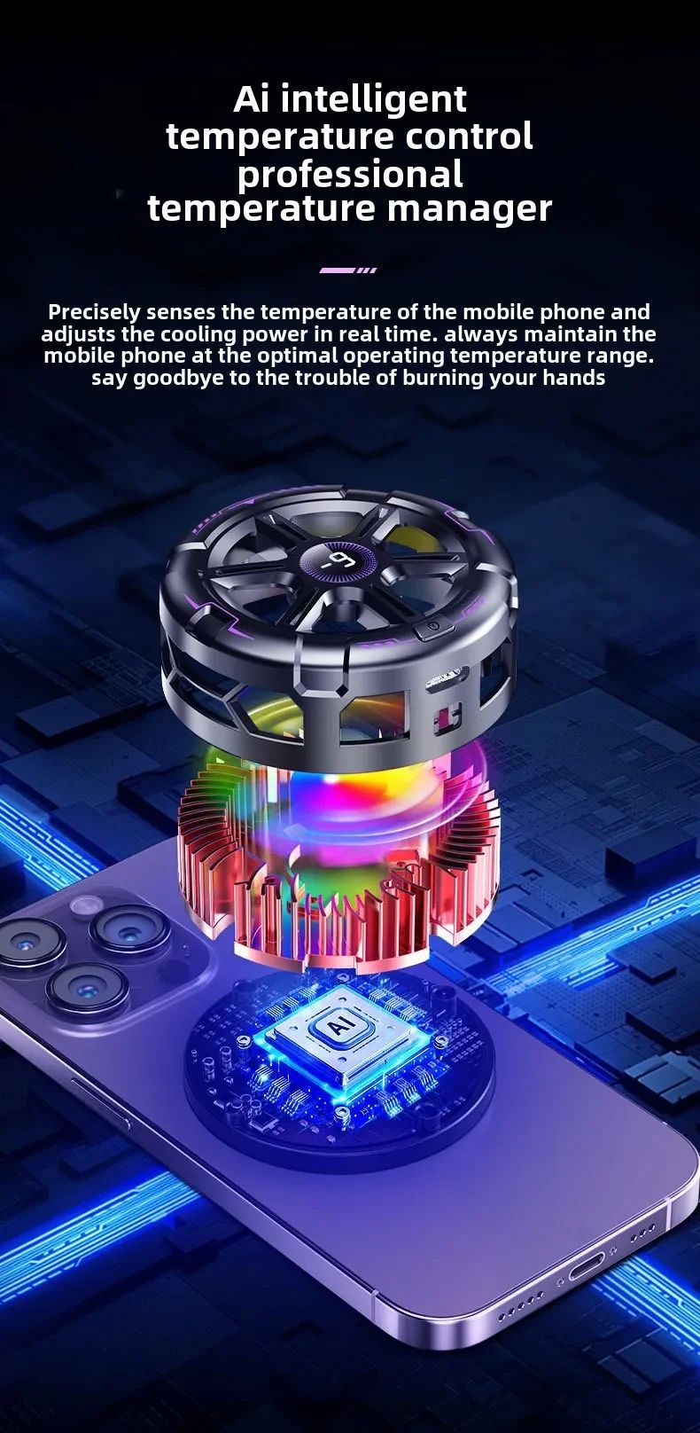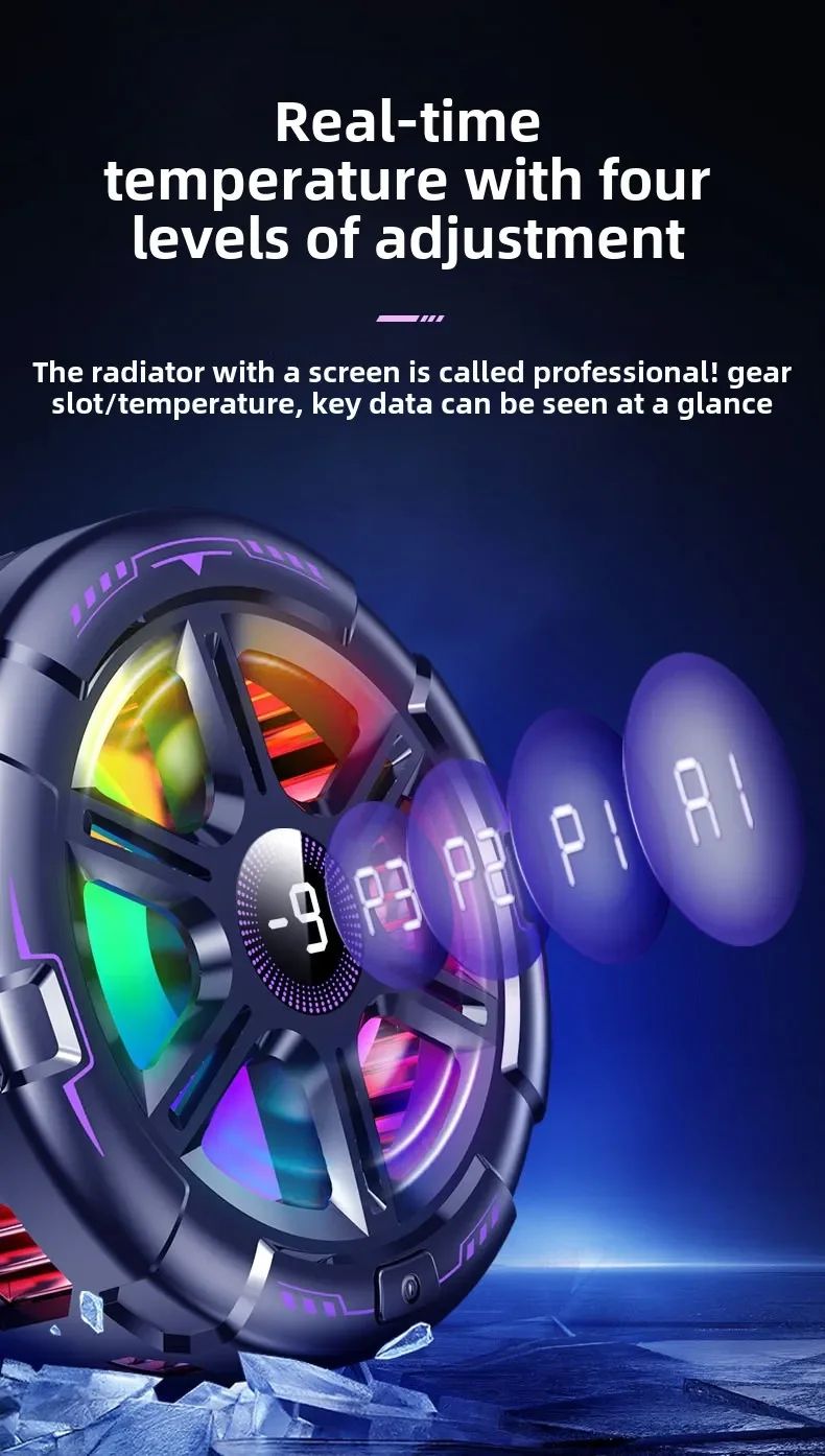 - Этот кулер автоматически анализирует температуру смартфона и регулирует мощность охлаждения в реальном времени. Это позволяет поддерживать оптимальную температуру без перегрева и лишнего энергопотребления.