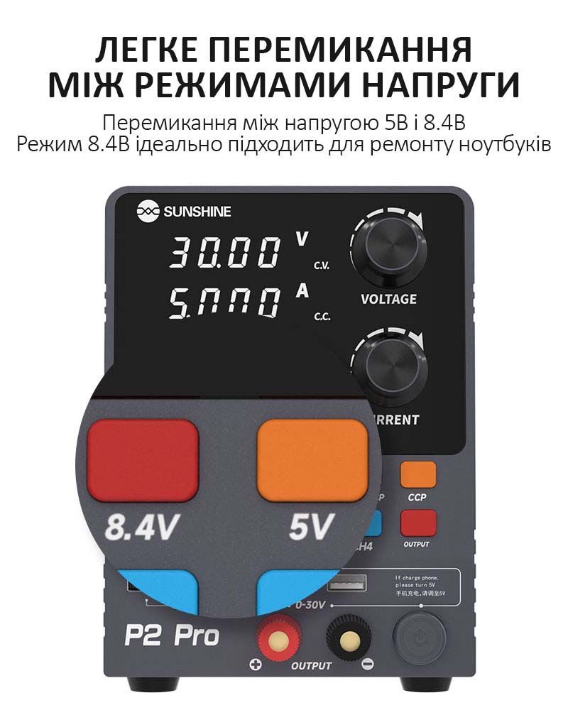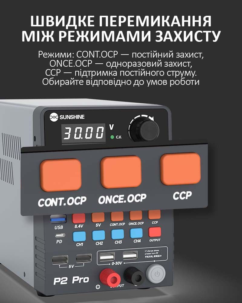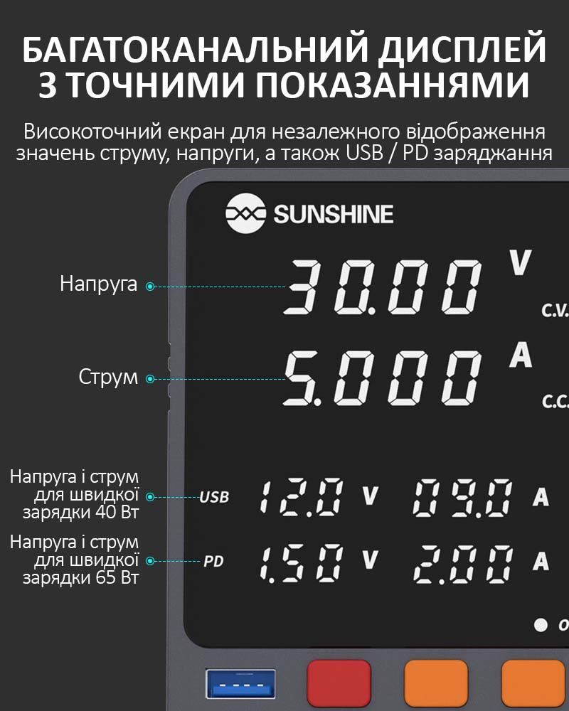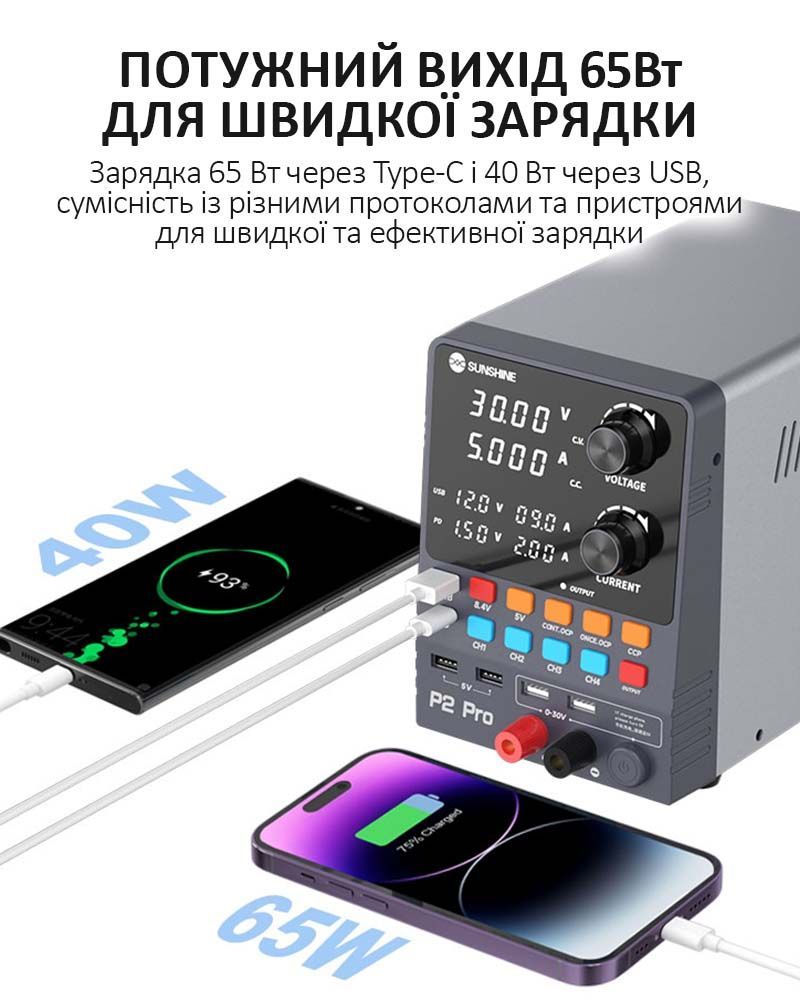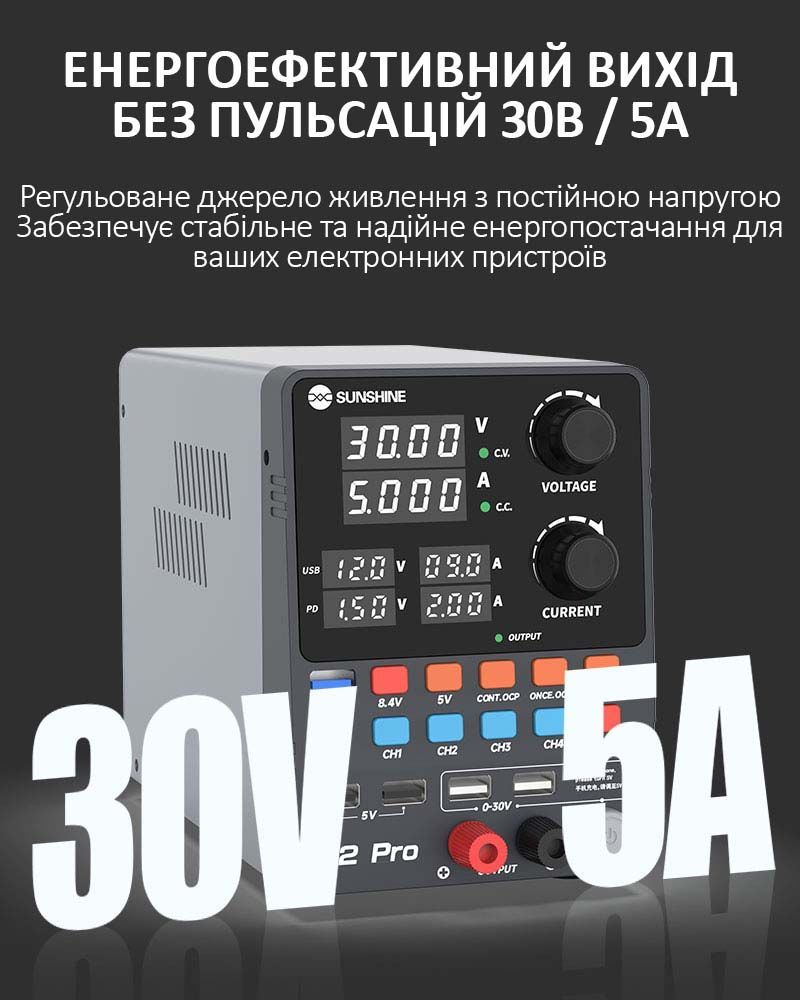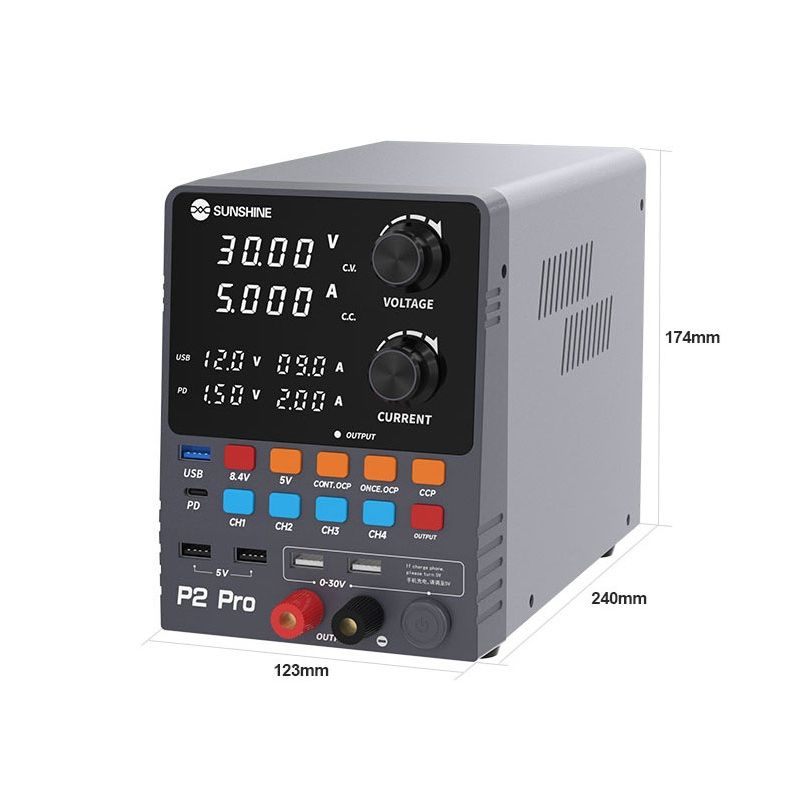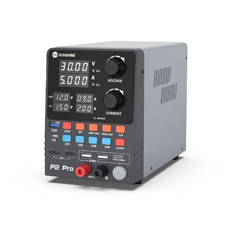 Sunshine P2 Pro — это профессиональный регулируемый блок питания постоянного тока, разработанный для точной настройки, тестирования и ремонта электроники. Устройство сочетает высокую мощность, интеллектуальное управление, многофункциональный дисплей и поддержку современных протоколов быстрой зарядки.