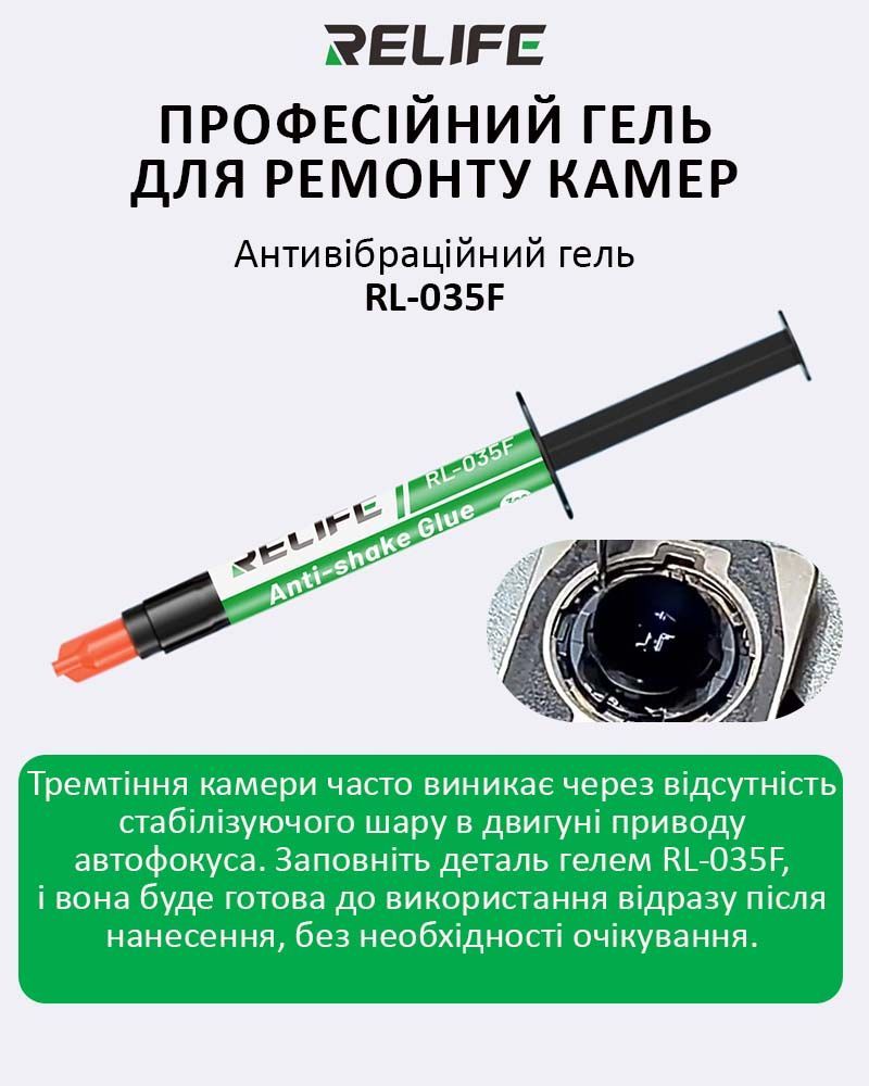 Антивибрационный гель RELIFE RL-035F — это профессиональное средство для устранения вибраций в модулях камер смартфонов и другой электроники. Продукт разработан специально для восстановления стабильной работы автофокуса и устранения дрожания изображения, вызванного износом или отсутствием демпфирующего слоя в механизме камеры. Этот гель эффективно фиксирует подвижные элементы, обеспечивая плавную работу привода автофокуса и повышая четкость снимков и видео.