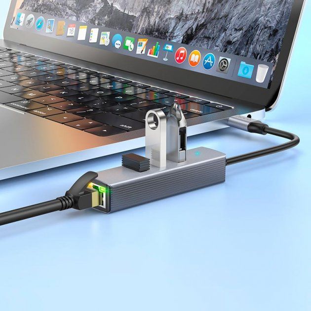 Адаптер Hoco HB34 (Type-C to RJ45 1Gbit Ethernet +3*USB3.0) Grey - это мощный инструмент для подключения вашего устройства к сети Ethernet и расширения возможностей USB.