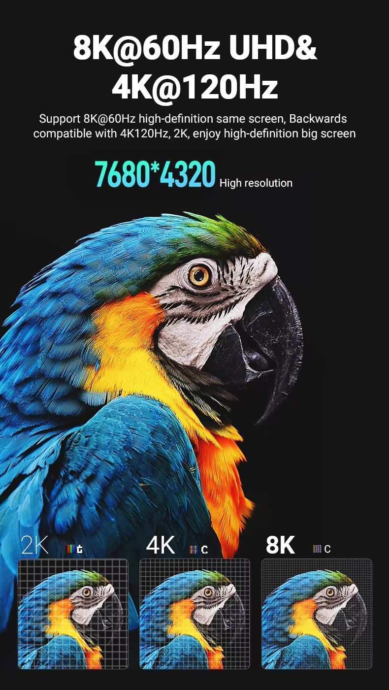 Поддержка 8K UHD разрешения до 7680 x 4320 пикселей при частоте 60 Гц, а также обратная совместимость с 4K@120 Гц и 2K.