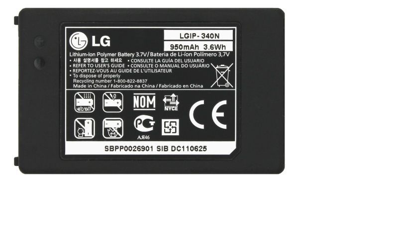 Для моделей LG: GW370, GR500, Xenon, GT350, GW520, GW525, KF900, Prada 2, KM555E, Clubby, KS500, KS550, KS660, KT770, AX265, AX840, GD300S, GR700, GT550, KF900, KM555, LX265, UN250 Маркировка АКБ: LGIP-340N