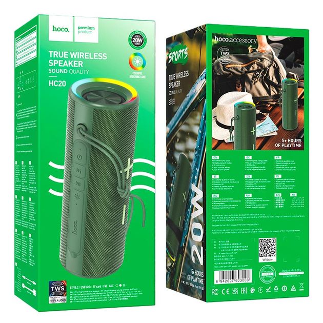 HOCO HC20 Акустика Luster sports BT5.2, TWS/FM/USB/TF/AUX, 20W, 5 часов (зелёная)