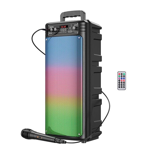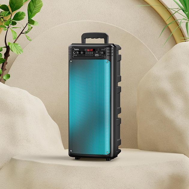 - HOCO BS52 станет незаменимым спутником для вечеринок, пикников, занятий йогой или дружеских встреч. Это не просто колонка, а полноценная система для караоке с микрофоном и светомузыкой.