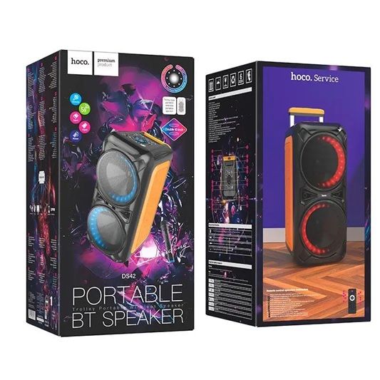HOCO DS42 — это мощная портативная акустическая система, созданная для ярких вечеринок, домашних развлечений и активного отдыха. Колонка оснащена двумя сабвуферами и твиттером, обеспечивающими мощные басы и кристально чистые средние и высокие частоты. LED RGB-подсветка с четырьмя режимами добавляет атмосферы, а два беспроводных цифровых микрофона делают её идеальным выбором для караоке.