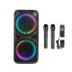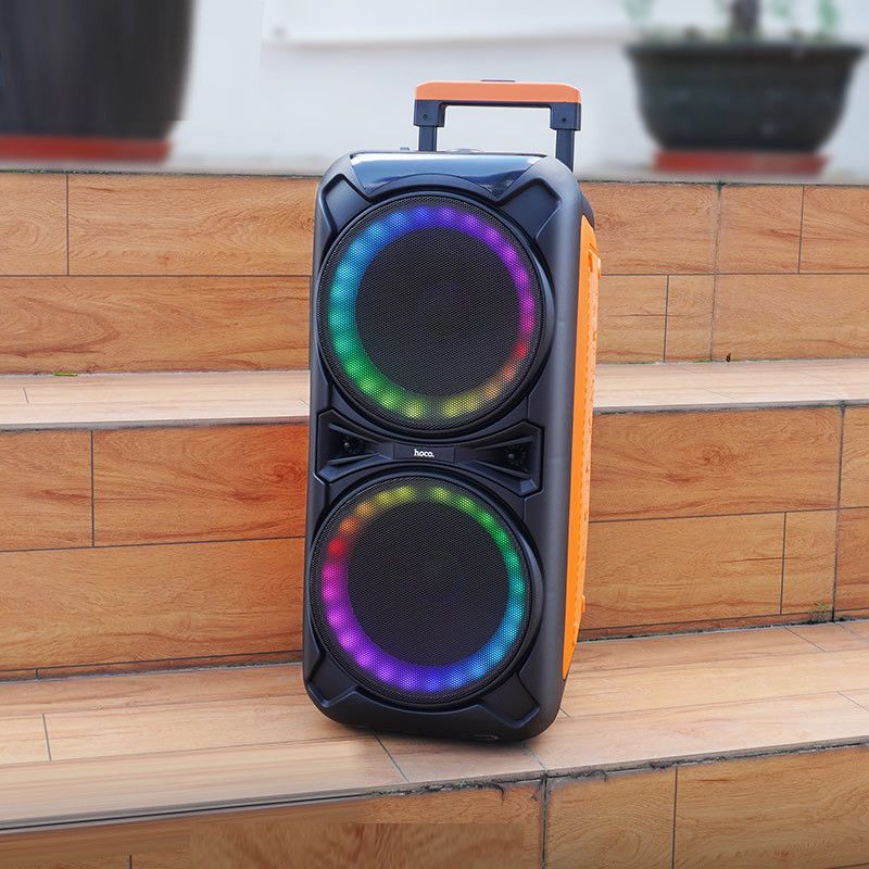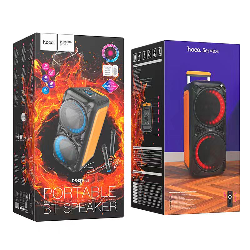 Hoco DS42 Plus — это мощная акустическая система для домашнего и уличного использования, созданная для проведения вечеринок, караоке и живых выступлений. Она снащена яркой RGB подсветкой, двумя беспроводными микрофонами и возможностью подключения музыкальных инструментов, что делает её универсальным центром развлечений.