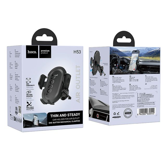 Hoco H53 – это ультратонкий и надежный автомобильный держатель, который крепится к вентиляционной решетке и обеспечивает стабильную фиксацию смартфона во время движения. Стильный минималистичный дизайн органично вписывается в интерьер автомобиля, а механизм push-type позволяет легко закреплять и снимать телефон одним движением.