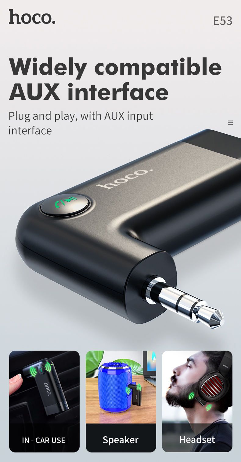 Bluetooth-адаптер Hoco E53 позволяет превратить любую аудиосистему в беспроводную, обеспечивая удобное прослушивание музыки и комфортное управление звонками в автомобиле. Устройство подключается к аудиосистеме через AUX-разъем и синхронизируется со смартфоном или планшетом по Bluetooth 5.0. Оснащено встроенным микрофоном с системой подавления шума DSR для четкой передачи голоса во время разговоров. Компактный корпус из прочного пластика и удобные кнопки управления делают использование адаптера максимально комфортным.