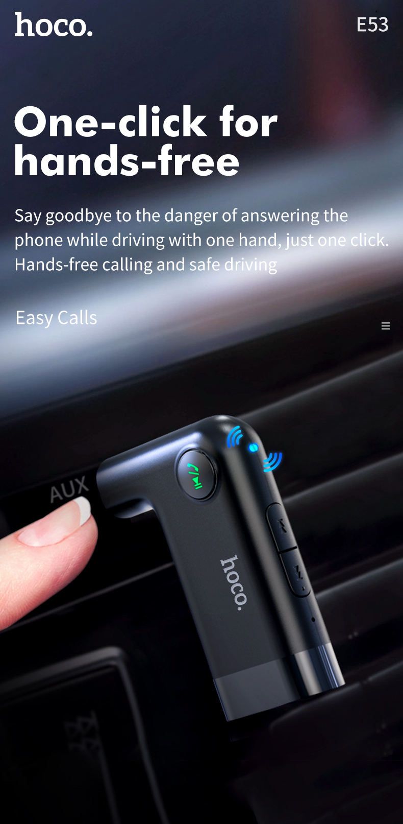 Авто Bluetooth адаптер Hoco E53, BT5.0, 10m, AUX, звонки, микрофон, 10 часов работы, micro-USB, Черный